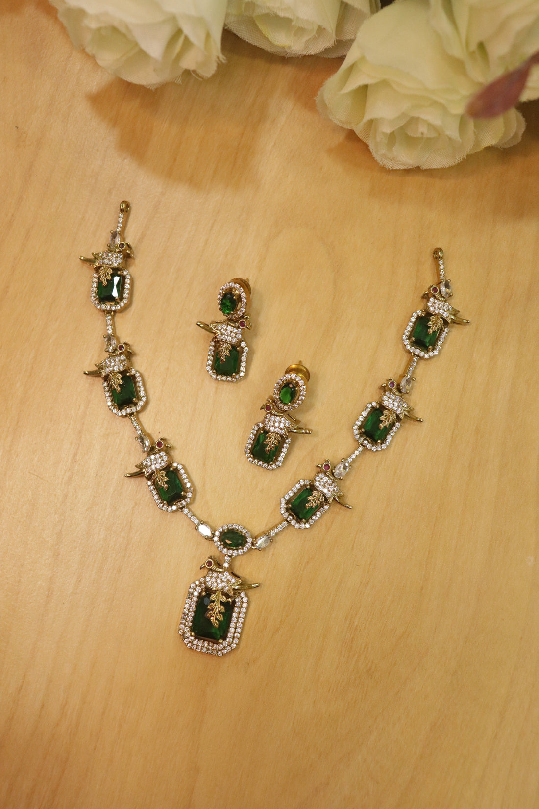 Royal Bird Motif AD Stone Necklace Set – Emerald Green Edition