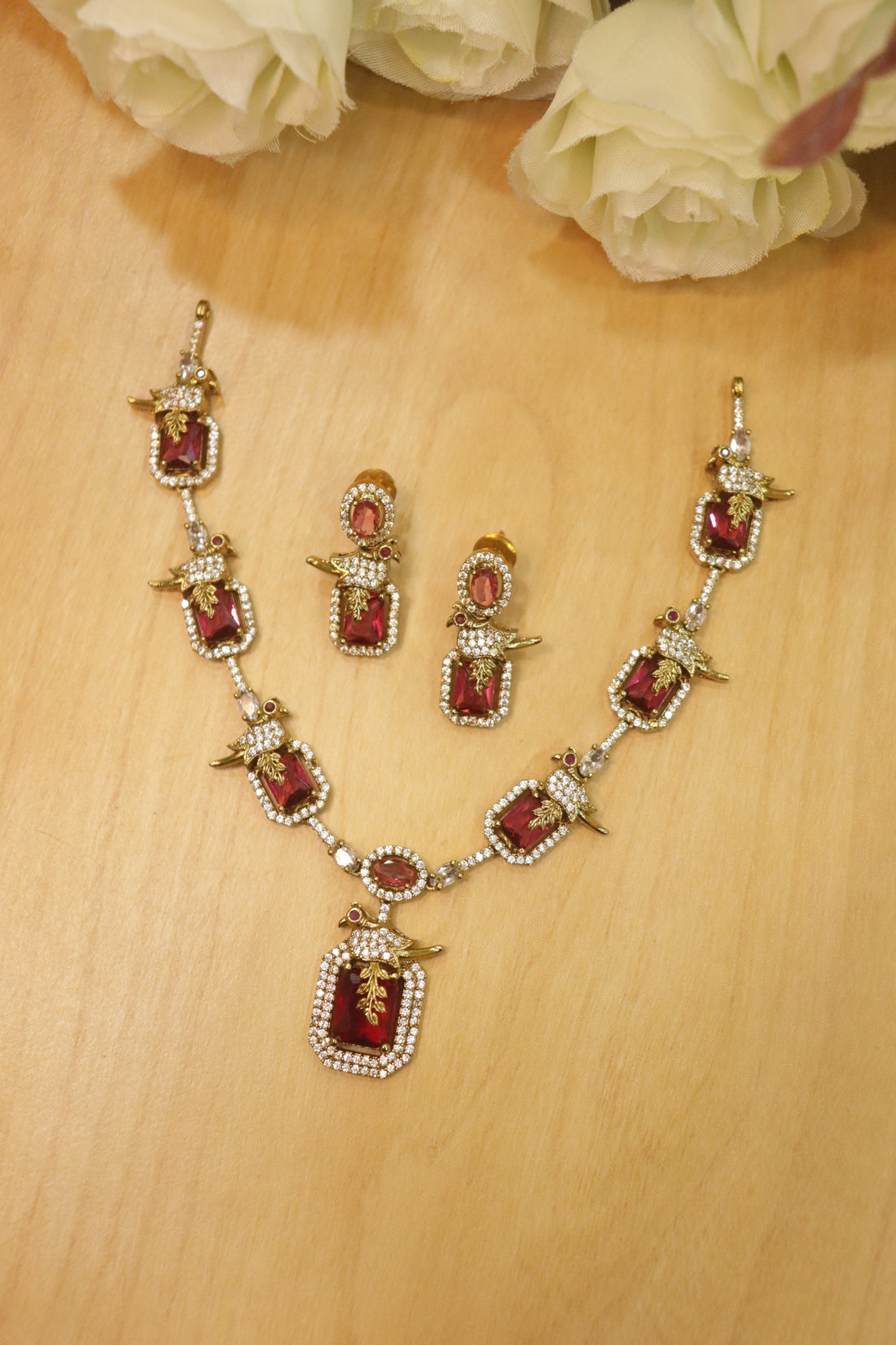 Royal Bird Motif AD Stone Necklace Set – Ruby Red Edition