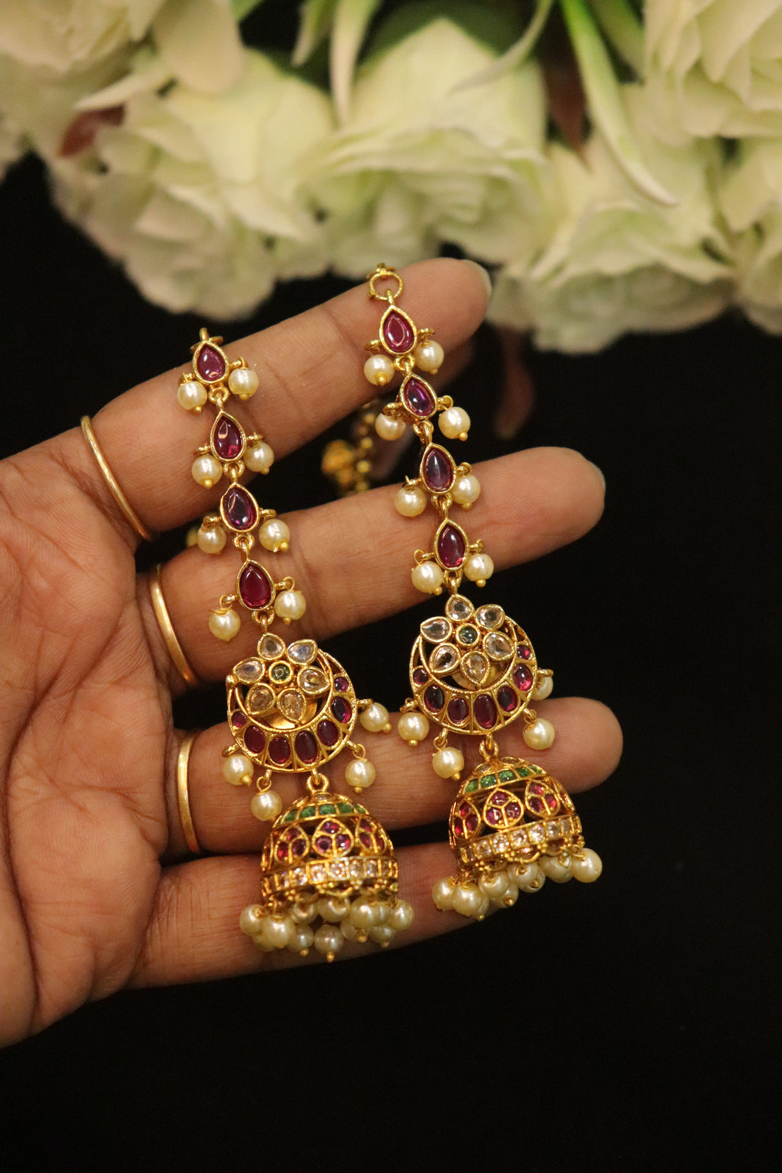 Celebrate timeless South Indian glamour with the Khushboo Inspired Royal GJ Polish Jhumka Earrings, a...