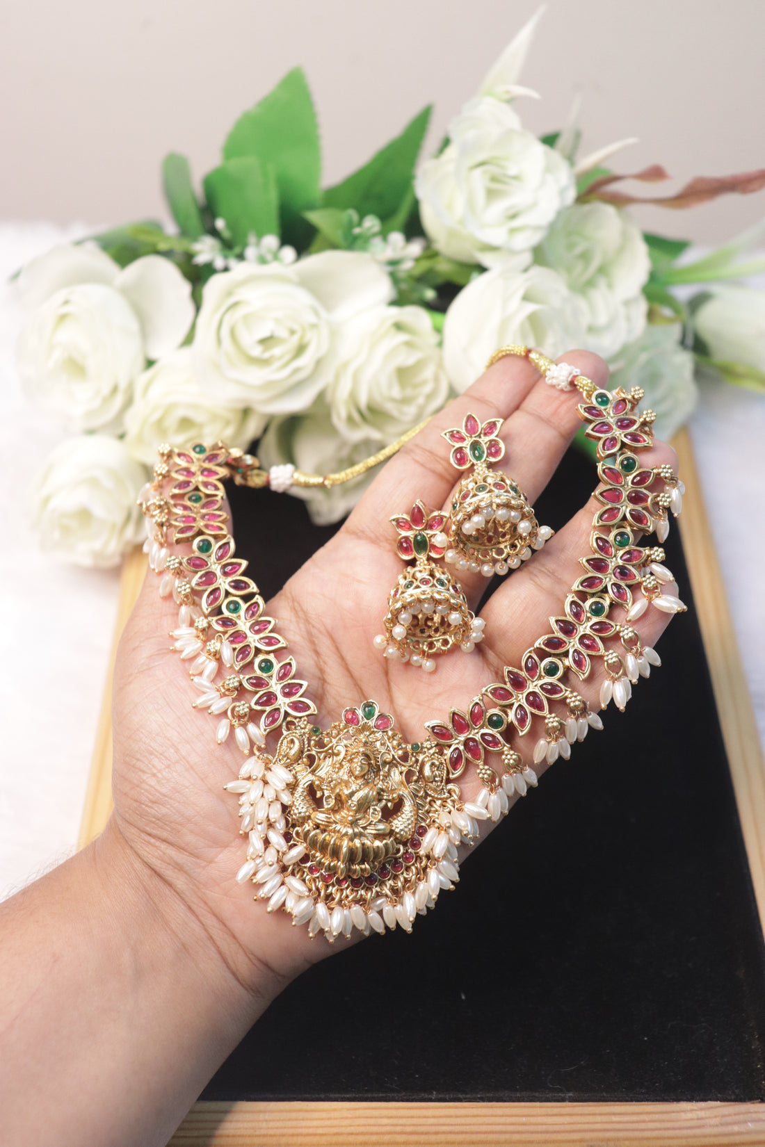 Lakshmi Matte Necklace with Ruby Stones & Rice Pearls