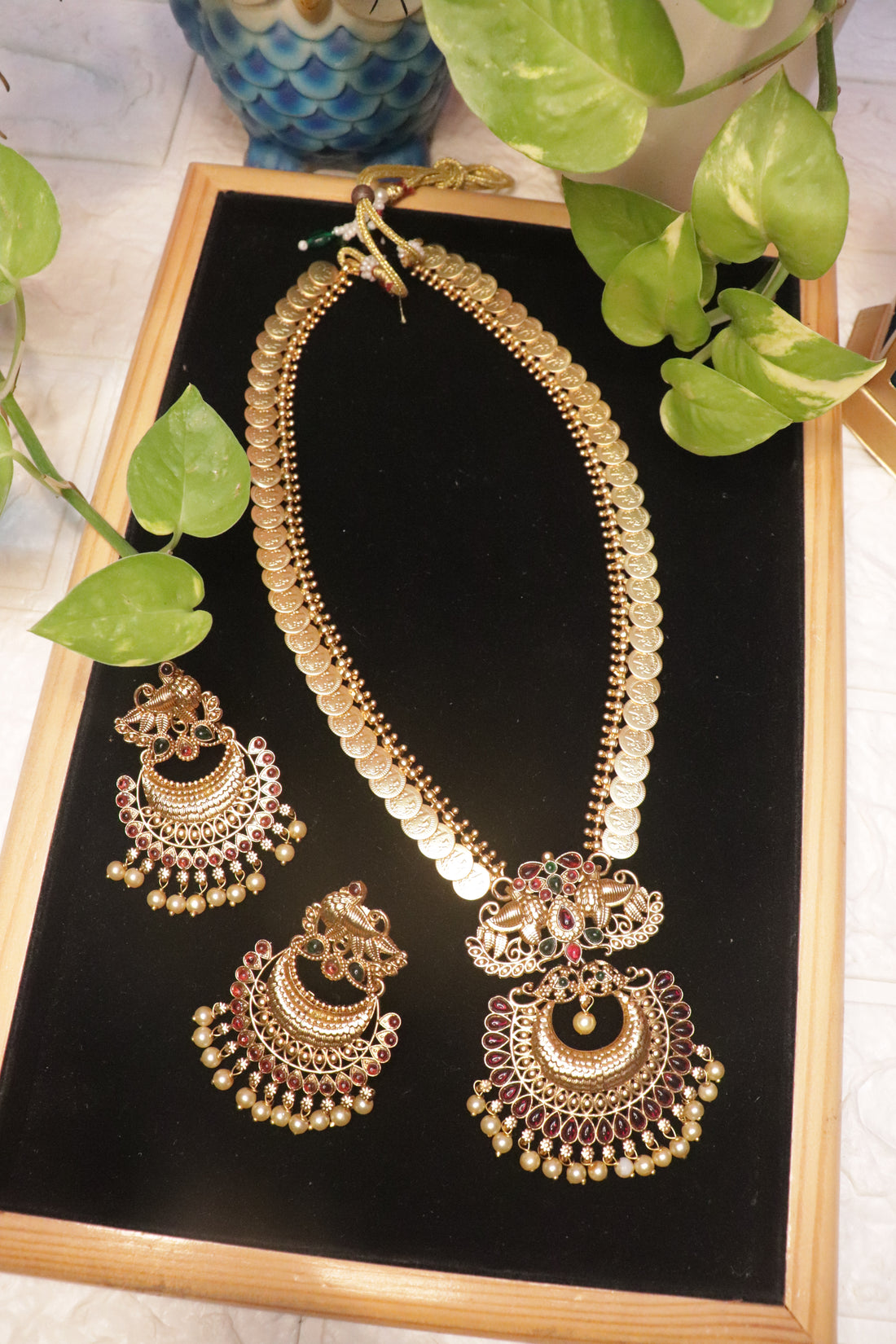 Step into timeless tradition with the Heritage Coin Peacock Matte Necklace Set, a majestic piece...