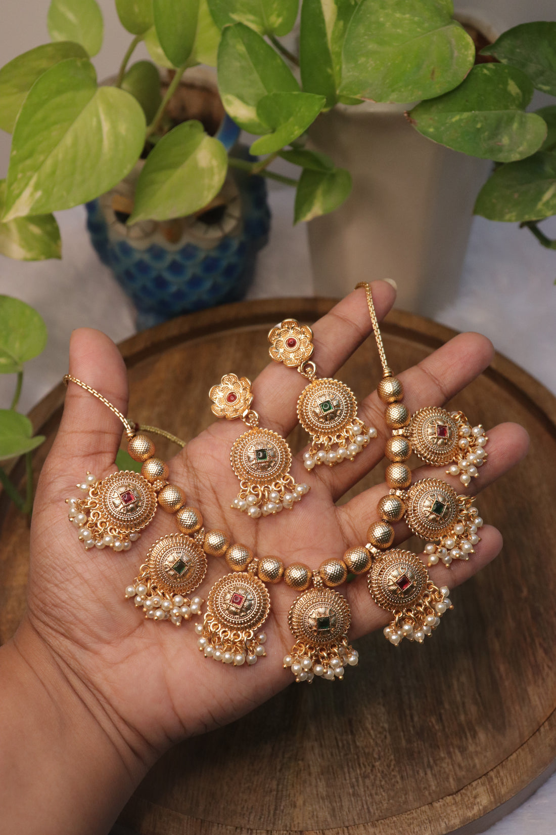 Embrace the soft, regal glow of tradition with the Pearl Aura Antique Necklace Set —...