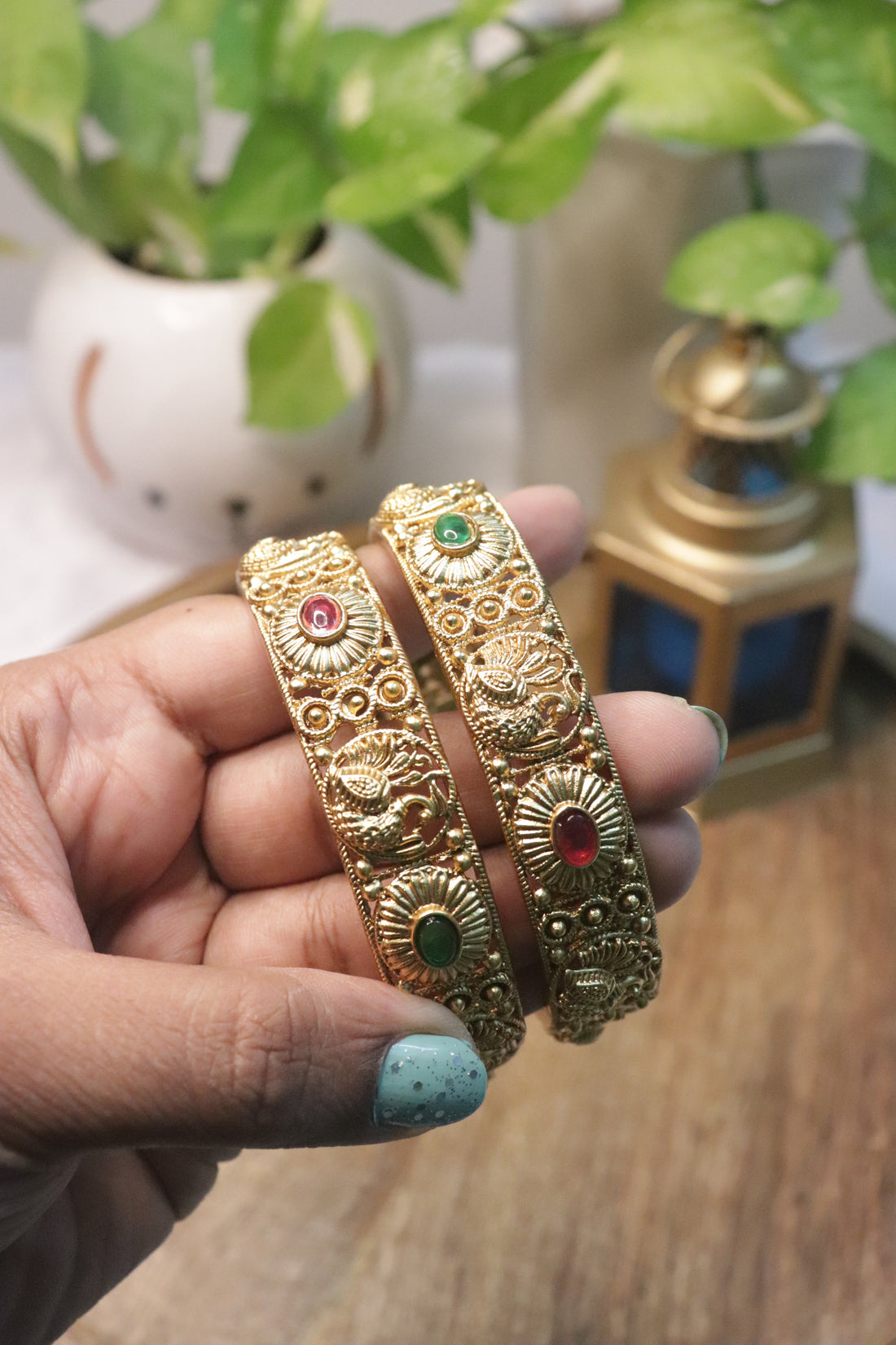 Regal Peacock Motif Antique Gold Bangles with Ruby & Emerald Accents