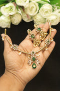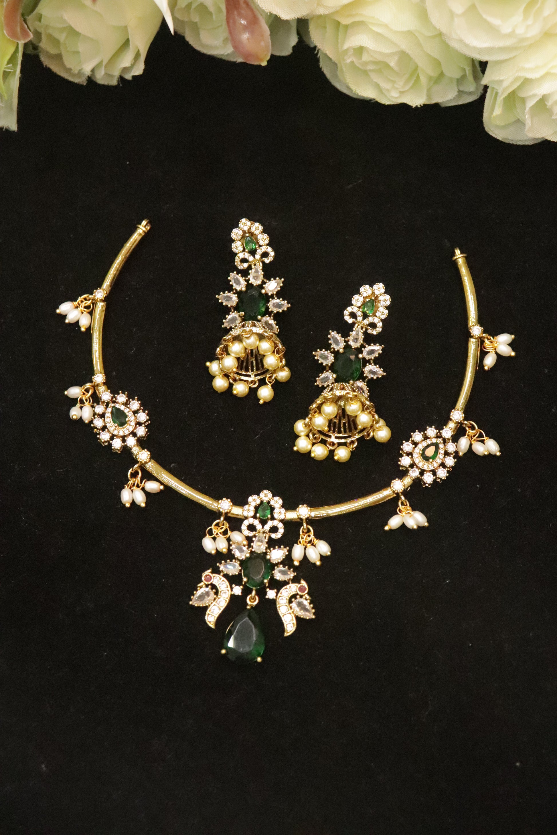Step into elegance with the Aarvi Peacock Grace Hasli Set — a radiant creation that captures the poise of tradition and the allure of modern artistry. The finely sculpted peacock pendant, paired with a flexible side chain and coordinated jhumkas, makes this piece a true statement of sophistication.