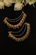 Celebrate timeless South Indian bridal elegance with the Antique Coin Temple Bridal Ear Chain, a beautifully crafted mattal designed to complement grand jhumkas. Featuring intricately detailed coin motifs inspired by traditional temple jewellery, this ear chain is enriched with ruby and emerald-tone stones and delicate bead danglings that add graceful movement. The dual pearl chains enhance both beauty and support, making it perfect for heavier bridal earrings. Finished in a rich antique gold polish, this piece adds a regal and heritage touch to wedding and festive ensembles.