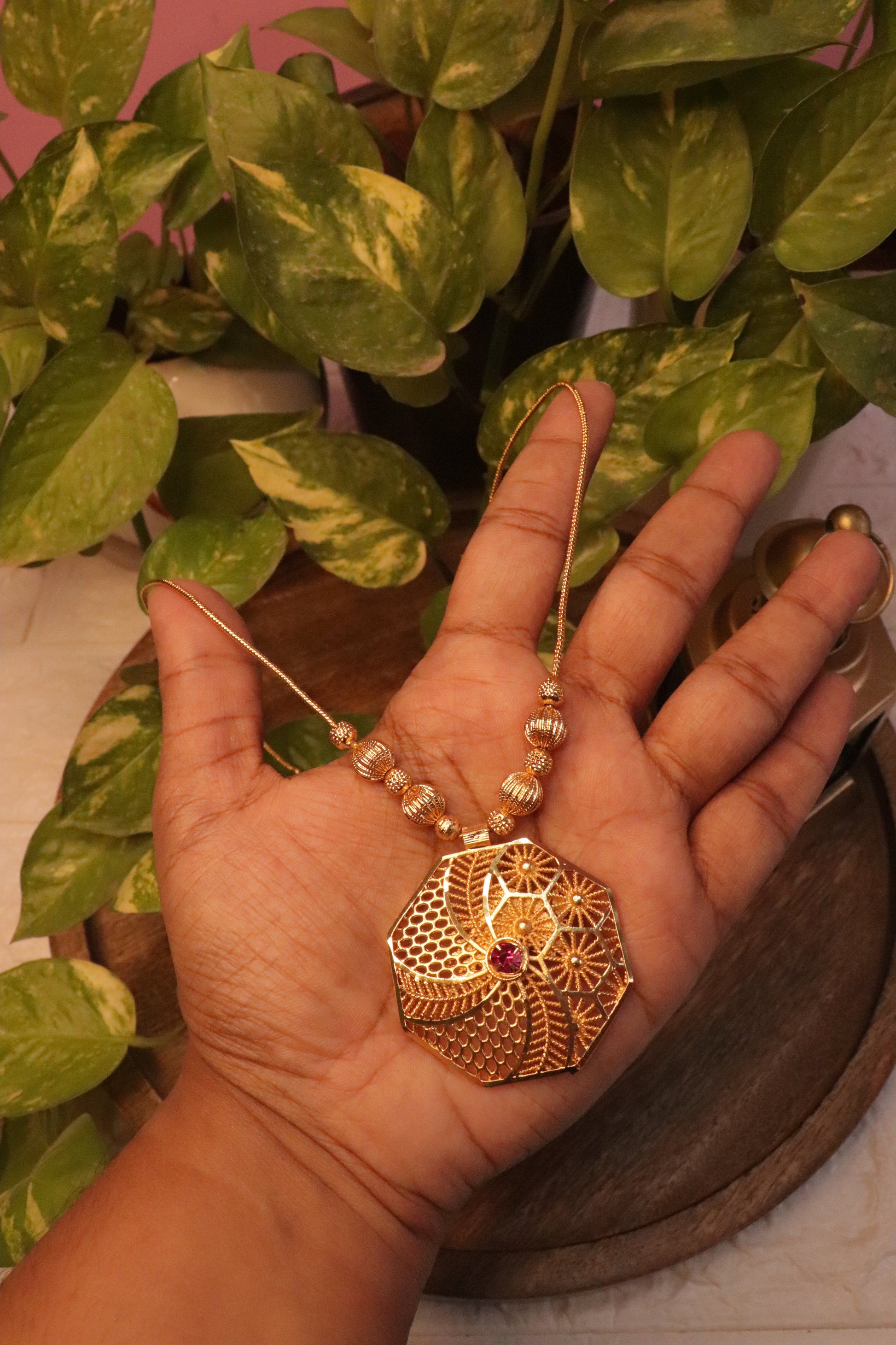 Make a bold yet graceful statement with the Antique Geometric Ruby Accent 18-Inch Microplated Chain. Designed with intricate craftsmanship, the octagonal pendant features detailed floral and mesh-inspired patterns, beautifully arranged in a symmetrical design. At the center sits a rich ruby-toned stone that adds a striking pop of color and regal charm.