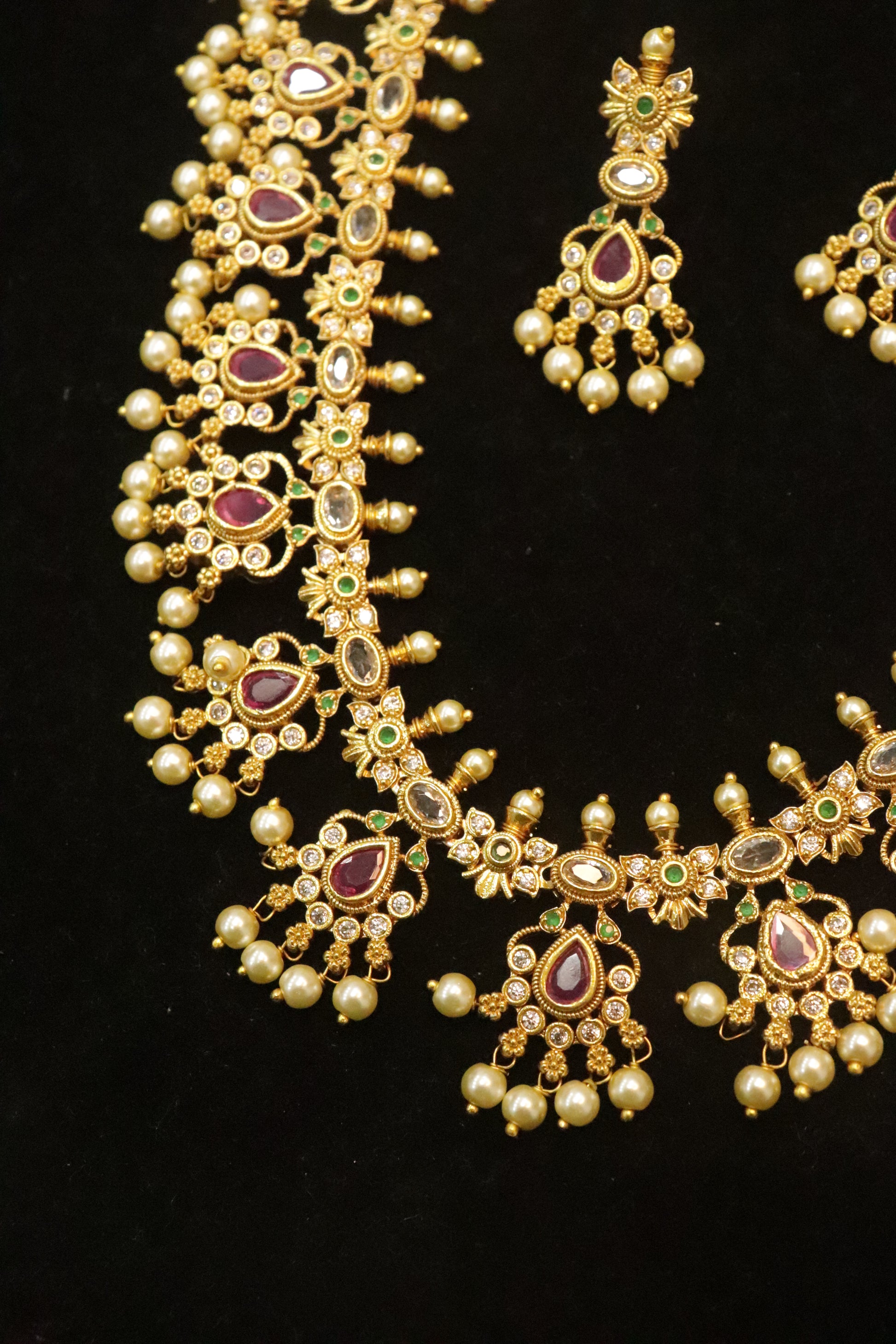 Celebrate the richness of tradition with the Antique Gutta Pusalu Heritage Haram Set, a stunning creation that blends classic artistry with graceful elegance. Featuring intricate paisley and floral motifs, the haram is beautifully accented with cascading gutta pearls that give it its signature opulent look. The matching earrings complete the ensemble with perfect harmony.