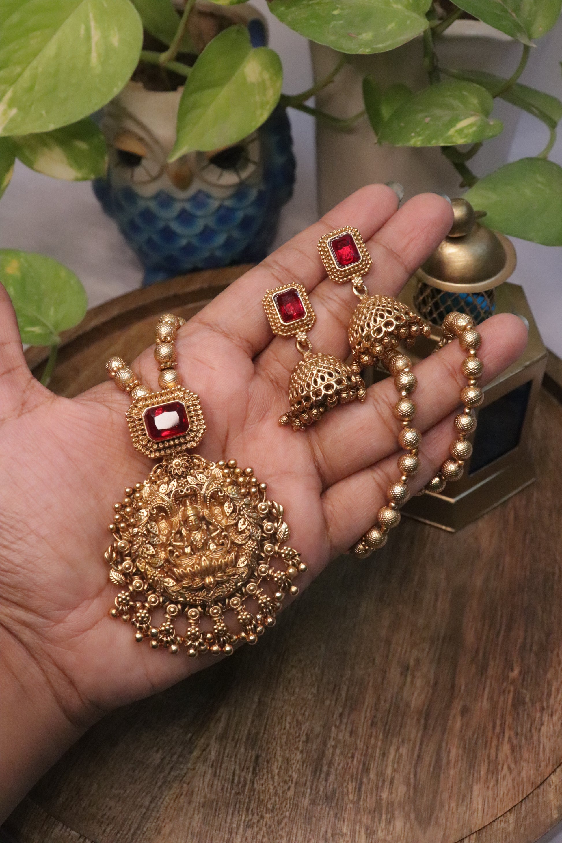 Pendant Detailing: Hand-carved Lakshmi motif surrounded by ornate patterns, intricate sculpting, and delicate droplet work for added richness.