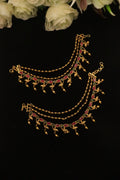 Add a royal traditional touch to your bridal look with the Antique Peacock Bridal Mattal, a beautifully crafted ear chain designed to enhance the elegance of classic jhumkas. Featuring intricate peacock-inspired motifs highlighted with rich ruby and emerald-toned kemp stones, this mattal reflects timeless South Indian temple jewellery artistry. The delicate bead danglings and layered side chains create a graceful cascading effect that frames the face beautifully while providing comfortable support for heavier earrings. Perfect for brides who love heritage-inspired jewellery with a majestic finish.