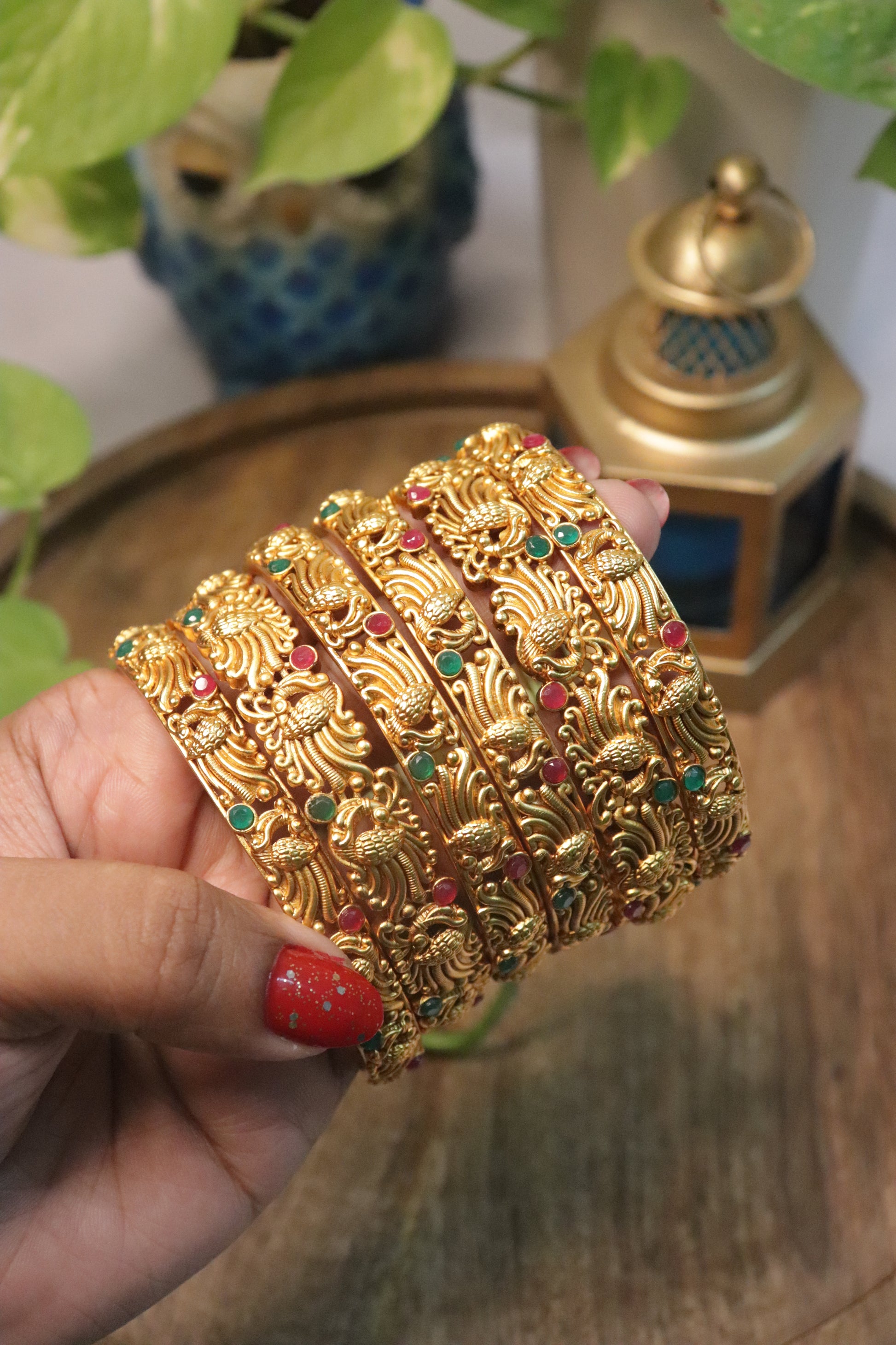 Antique Peacock Design Gold Bangles Set of 6 with Ruby & Emerald Stones
