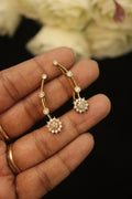Stone Detail: Sparkling round stones aligned along the curve, finished with a shimmering floral cluster drop.