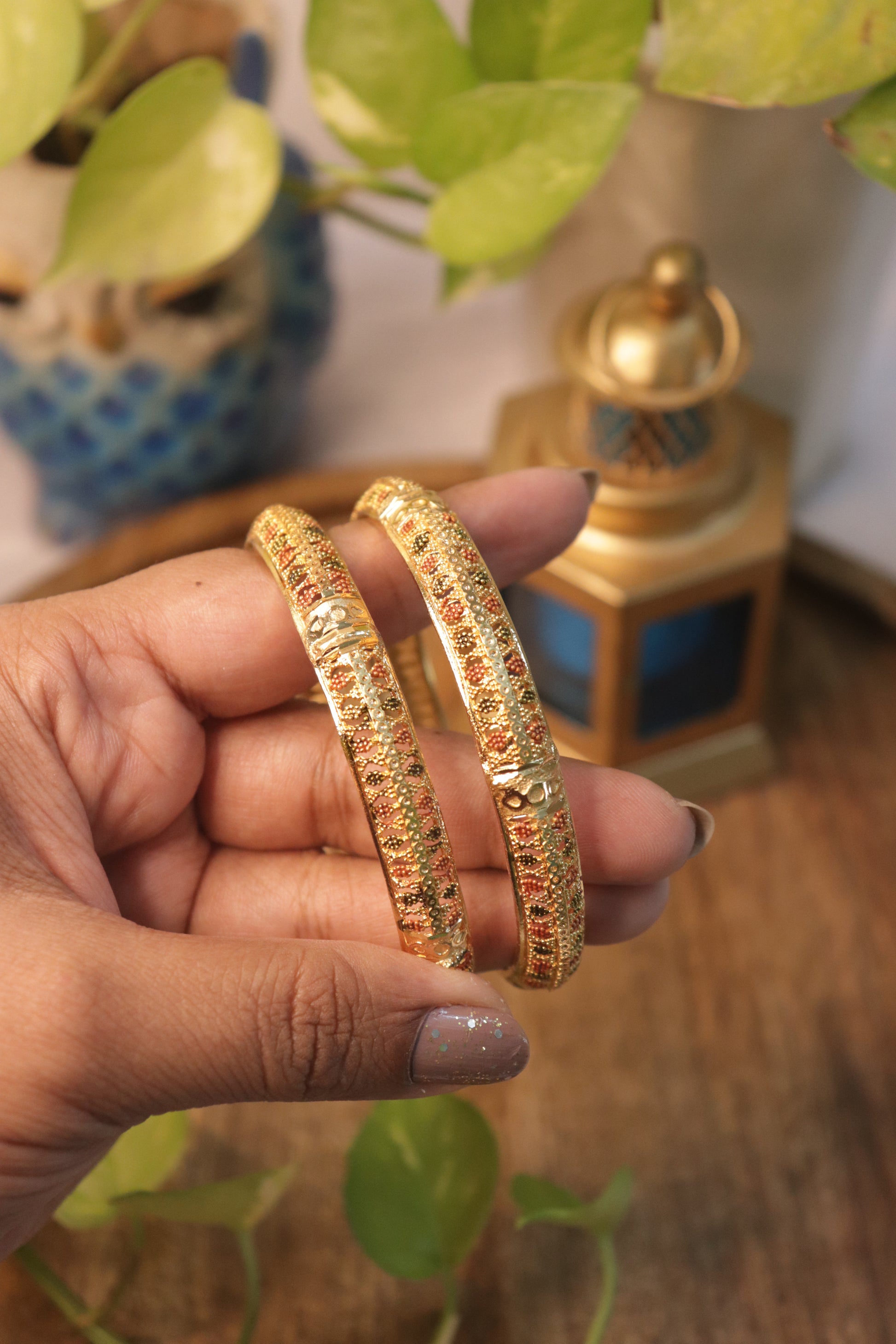 Graceful and timeless, the Classic Textured Microplated Bangles – Set of 2 are a must-have addition to your jewellery collection, effortlessly complementing both simple and ornate ethnic ensembles.