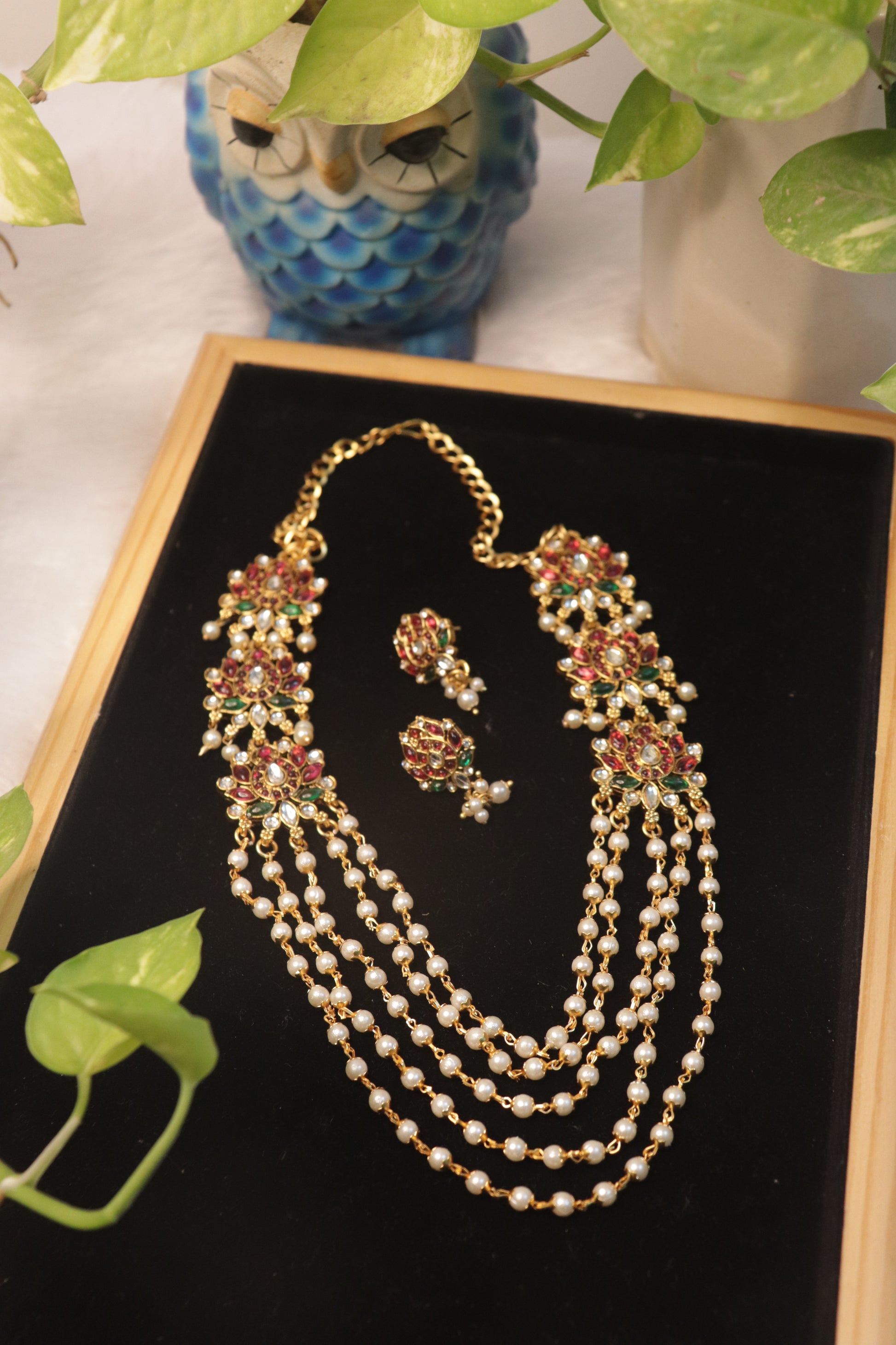 Classic Design: Multi-layered pearl strands gracefully merge with intricate lotus motifs for a royal finish.