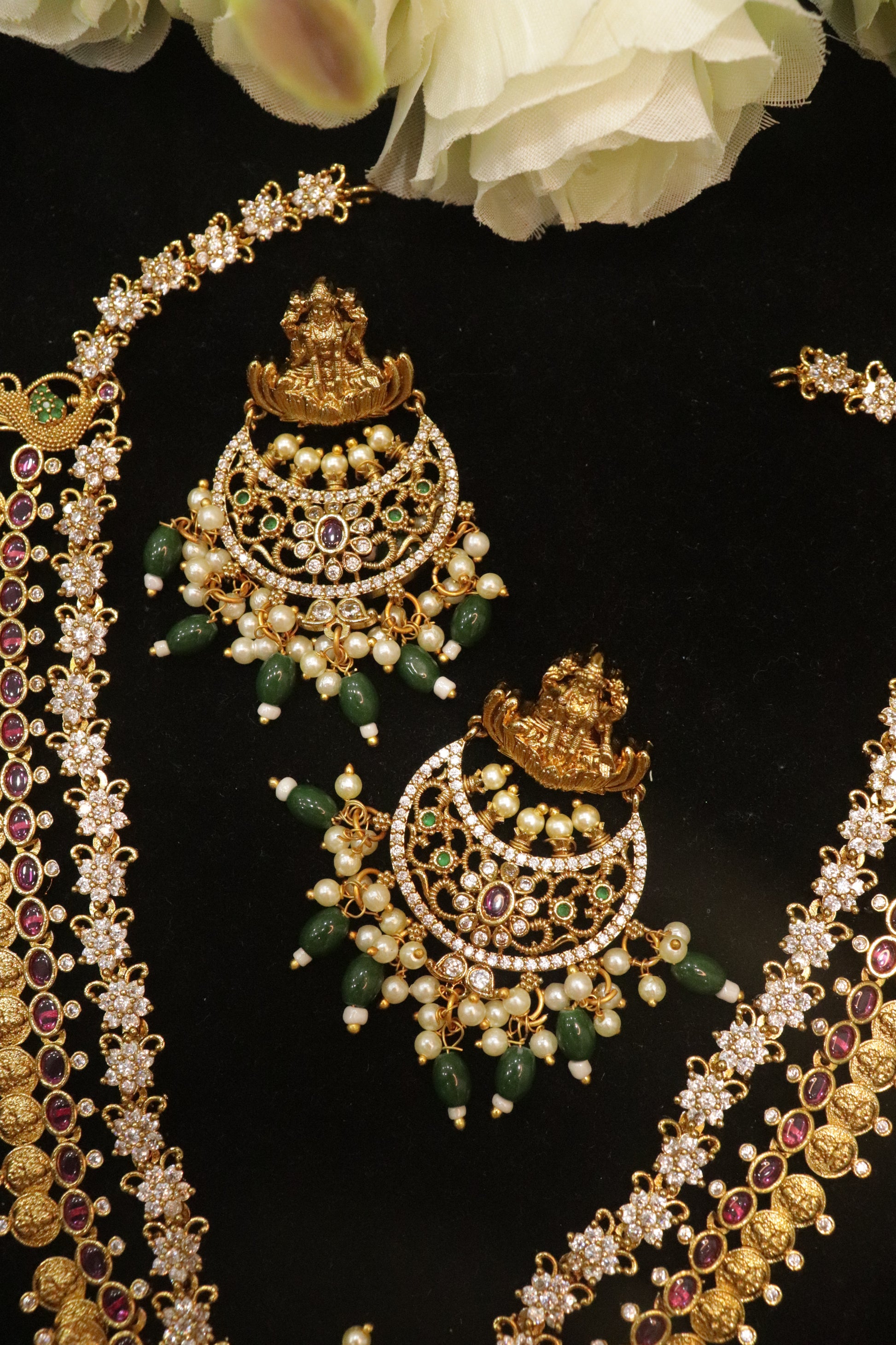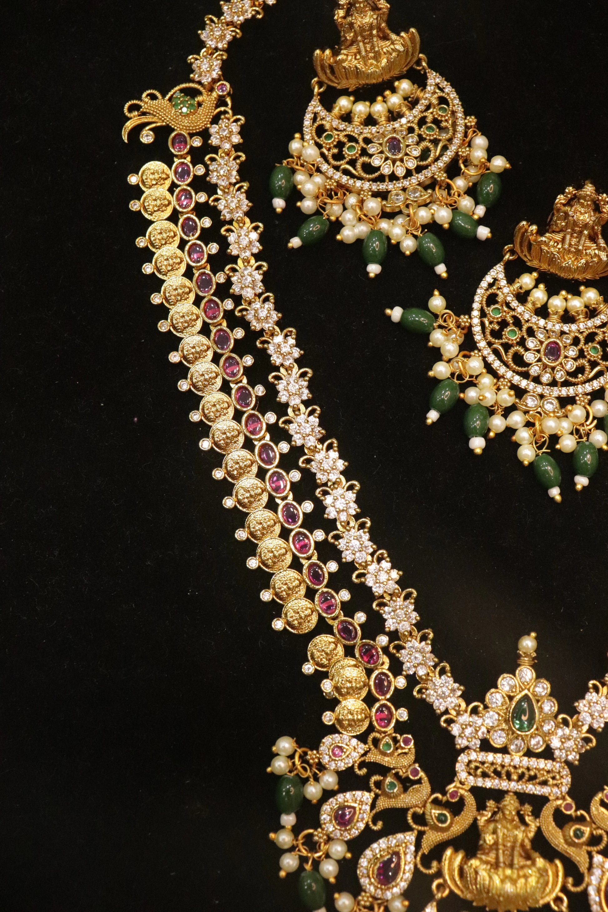 Bring home the charm of tradition with the Divine Gold Lakshmi Antique Haram Set.