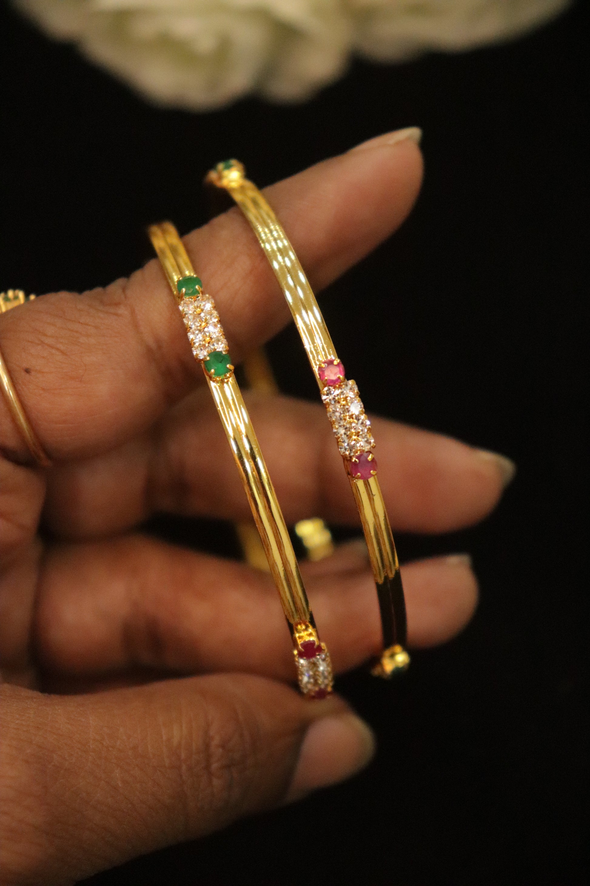 Add a touch of vibrant elegance to your jewellery collection with the Divine Spark Multi-Stone AD Microplated Bangles. Designed with a sleek gold-toned finish, these bangles feature a delicate cluster of shimmering AD stones at the center, beautifully accented with rich green and pink stone highlights. The minimal yet eye-catching detailing makes them perfect for both everyday grace and festive charm.