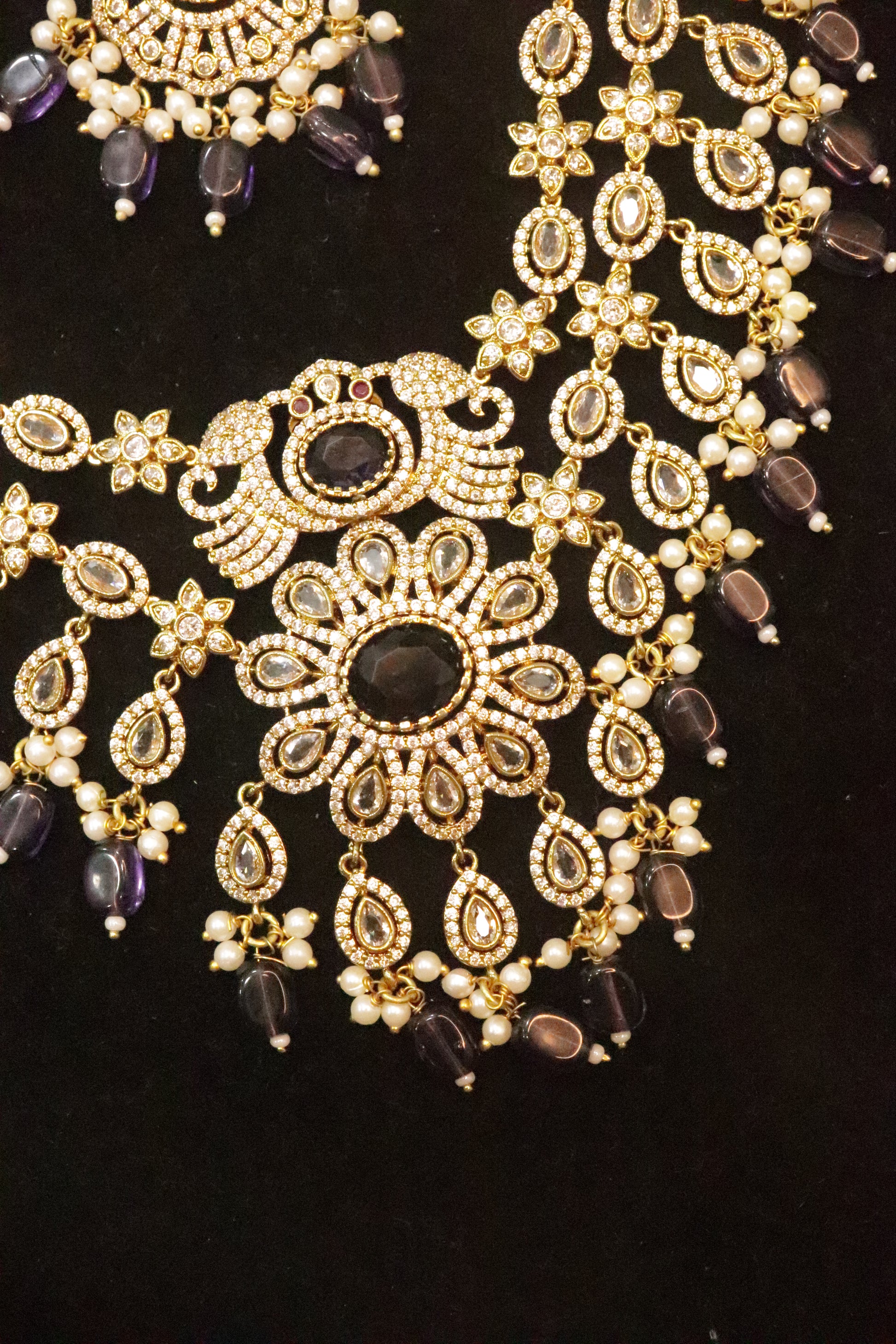 Bask in ethereal elegance with the Elara Purple Radiance AD Necklace Set — a masterpiece that blends moissanite-like brilliance with soothing purple charm. Designed to illuminate your every celebration, it captures the essence of grace and grandeur in perfect balance.