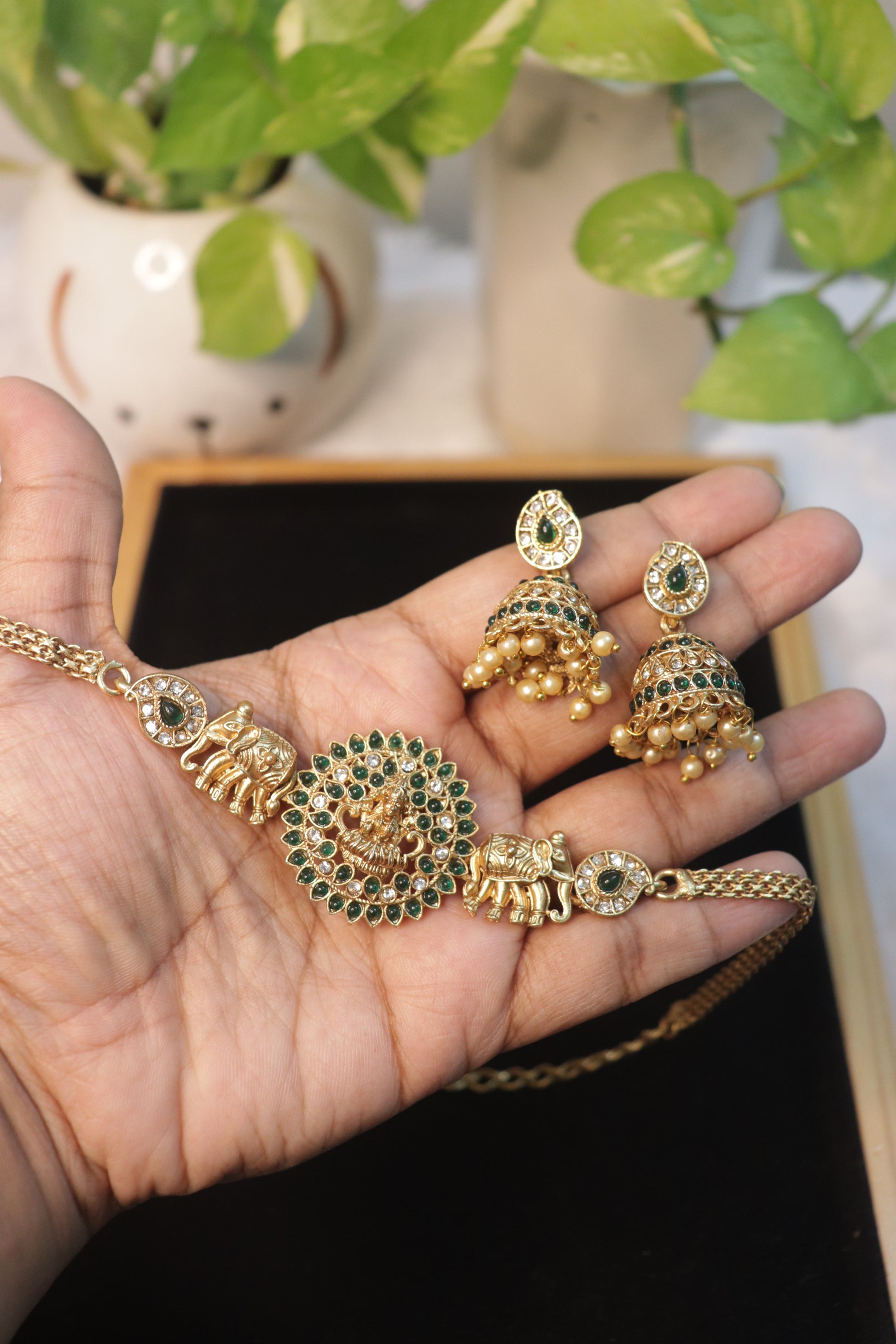 Step into timeless elegance with the Elephant Motif Lakshmi Matte Finish Choker Set, a beautifully crafted piece that celebrates heritage artistry. The centerpiece features a divine Lakshmi medallion surrounded by intricately arranged shimmering stones, creating a radiant, sacred aura. Flanking the pendant are exquisitely detailed elephant motifs—symbols of strength, prosperity, and royal grace—each embellished with delicate stone accents for added brilliance.