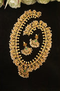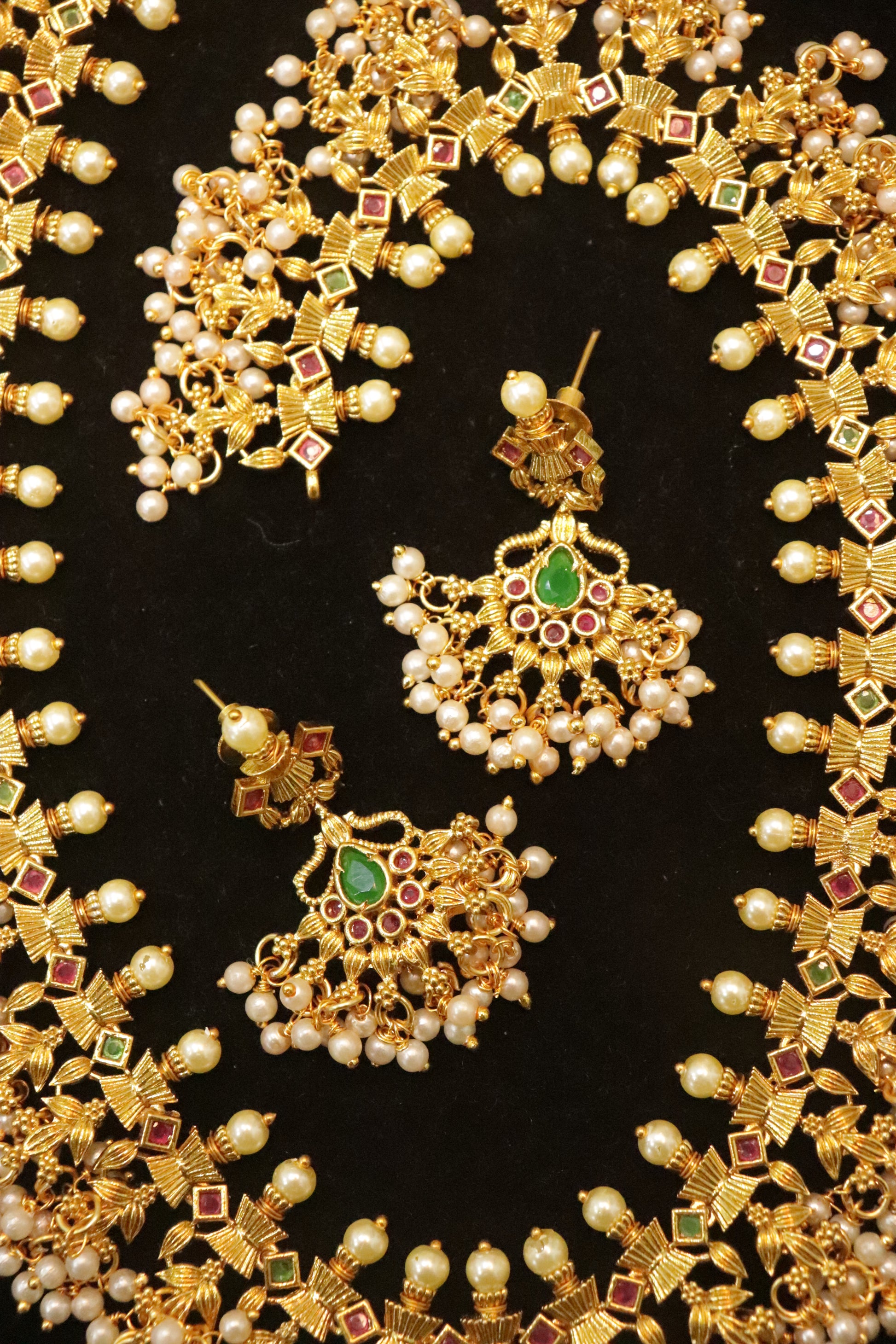 Evoke the grandeur of South Indian heritage with the Emerald Blossom Temple Necklace Set, a resplendent creation that celebrates timeless artistry. Crafted in a radiant antique gold finish, this necklace beautifully combines traditional motifs with pearl and gemstone detailing for a look that’s both regal and graceful.