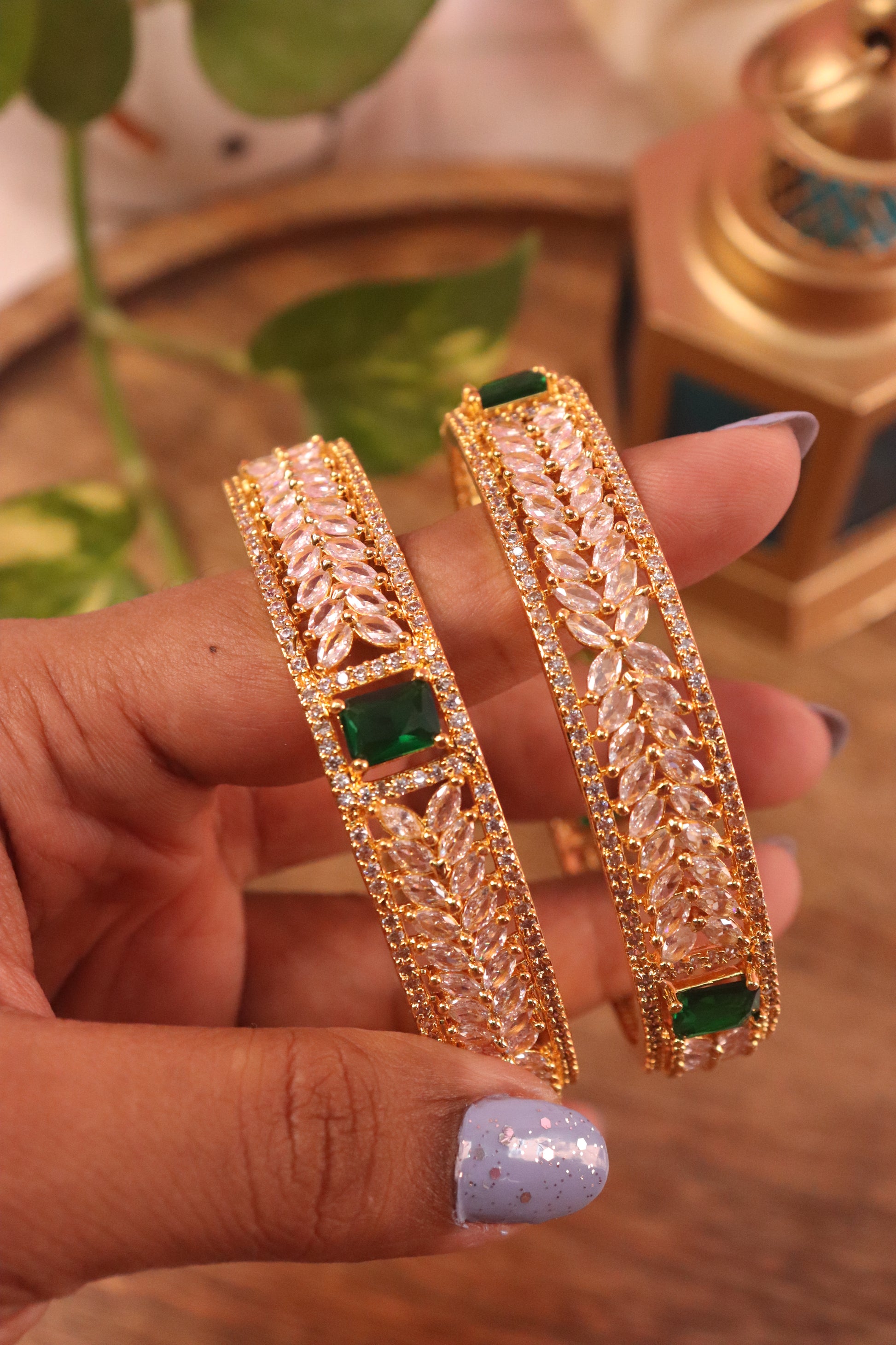 Step into timeless elegance with these Regal Emerald & CZ Leaf Bangles, masterfully crafted in a premium microplated gold finish. The bangles feature a breathtaking leaf motif adorned with marquise-cut CZ stones, paired with bold emerald green centerpieces that exude royal charm. Each detail sparkles with sophistication, making these bangles a statement of luxury and grace.