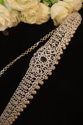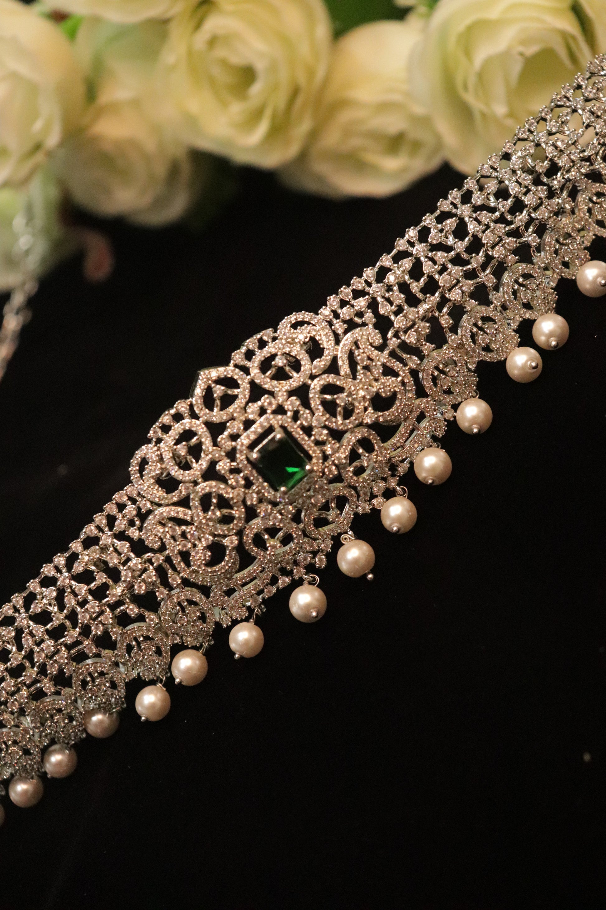 Step into the spotlight with the Emerald Glow White AD Rhodium Hipbelt — a breathtaking fusion of sparkling white brilliance and luxurious emerald allure. Crafted with a stunning mesh of shimmering AD stones, this hipbelt steals the show with its bold emerald-green centrepiece and elegant pearl drops that sway with every move. A true statement accessory for brides and style Queens who love unforgettable sparkle.