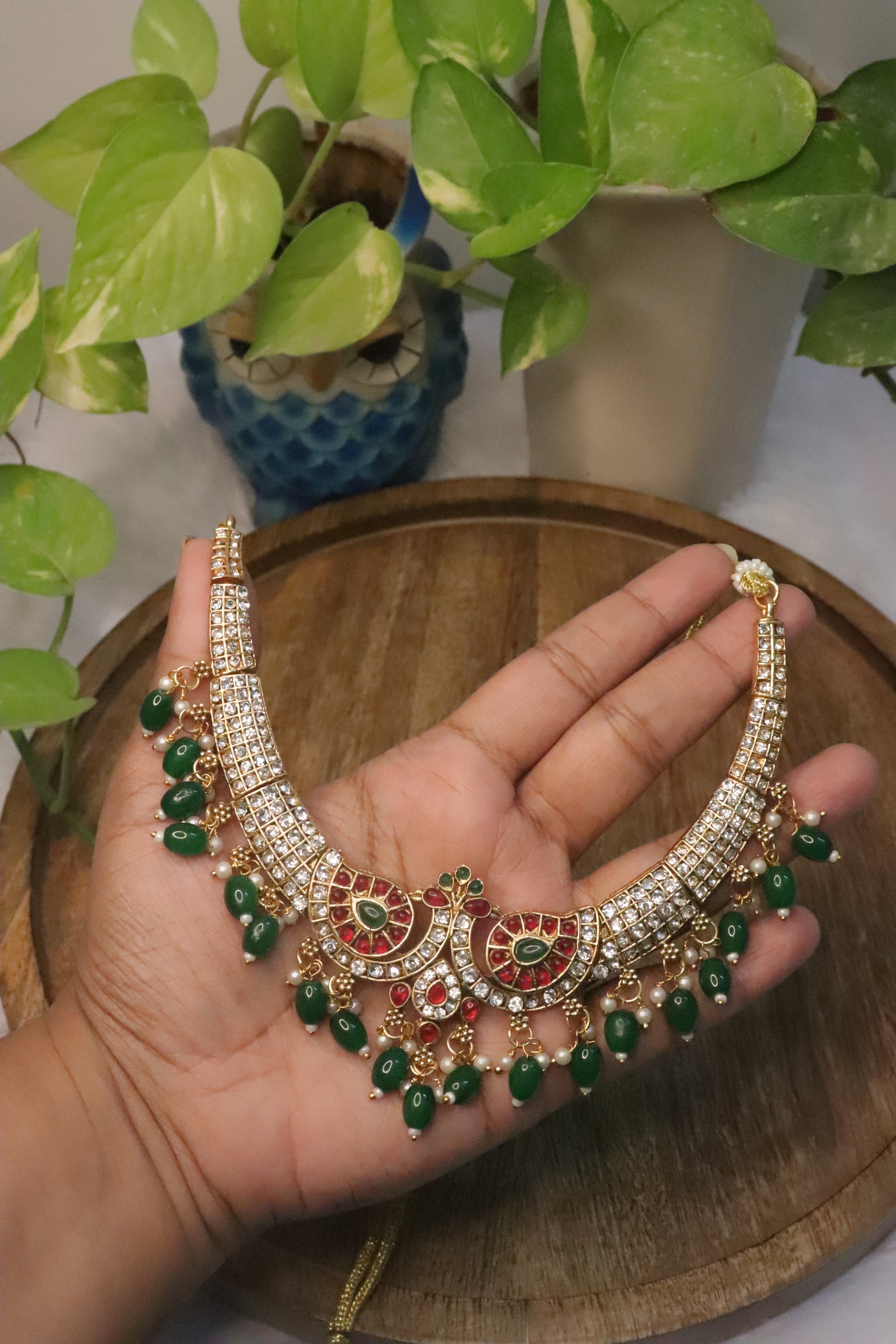 A perfect harmony of artistry and elegance — the Emerald Plume Peacock Hasli Choker Set adds a distinguished, royal glow to every occasion.