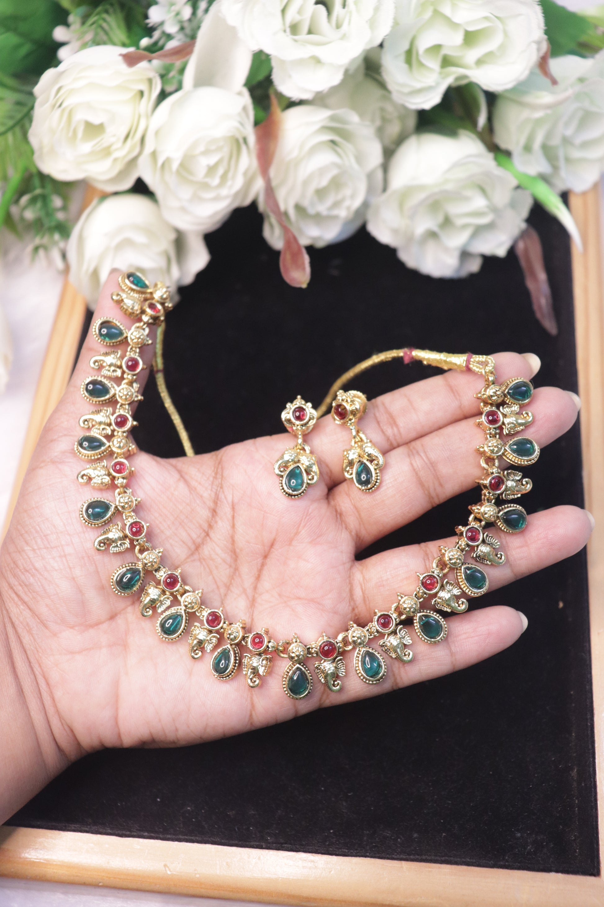 Radiate vintage charm with the Emerald Rouge Drop Necklace Set — a graceful creation that celebrates the timeless pairing of deep green and ruby hues in a rich matte gold finish. Perfectly crafted for traditional elegance, this piece brings a royal touch to your festive and wedding looks.