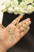 Radiate refined beauty with the Eternal Grace AD Stone Necklace Set — a stunning blend of elegance and sparkle. The centerpiece teardrop pendant, surrounded by layers of shimmering CZ stones and finished with a lustrous gold tone, makes this design a timeless statement of sophistication.