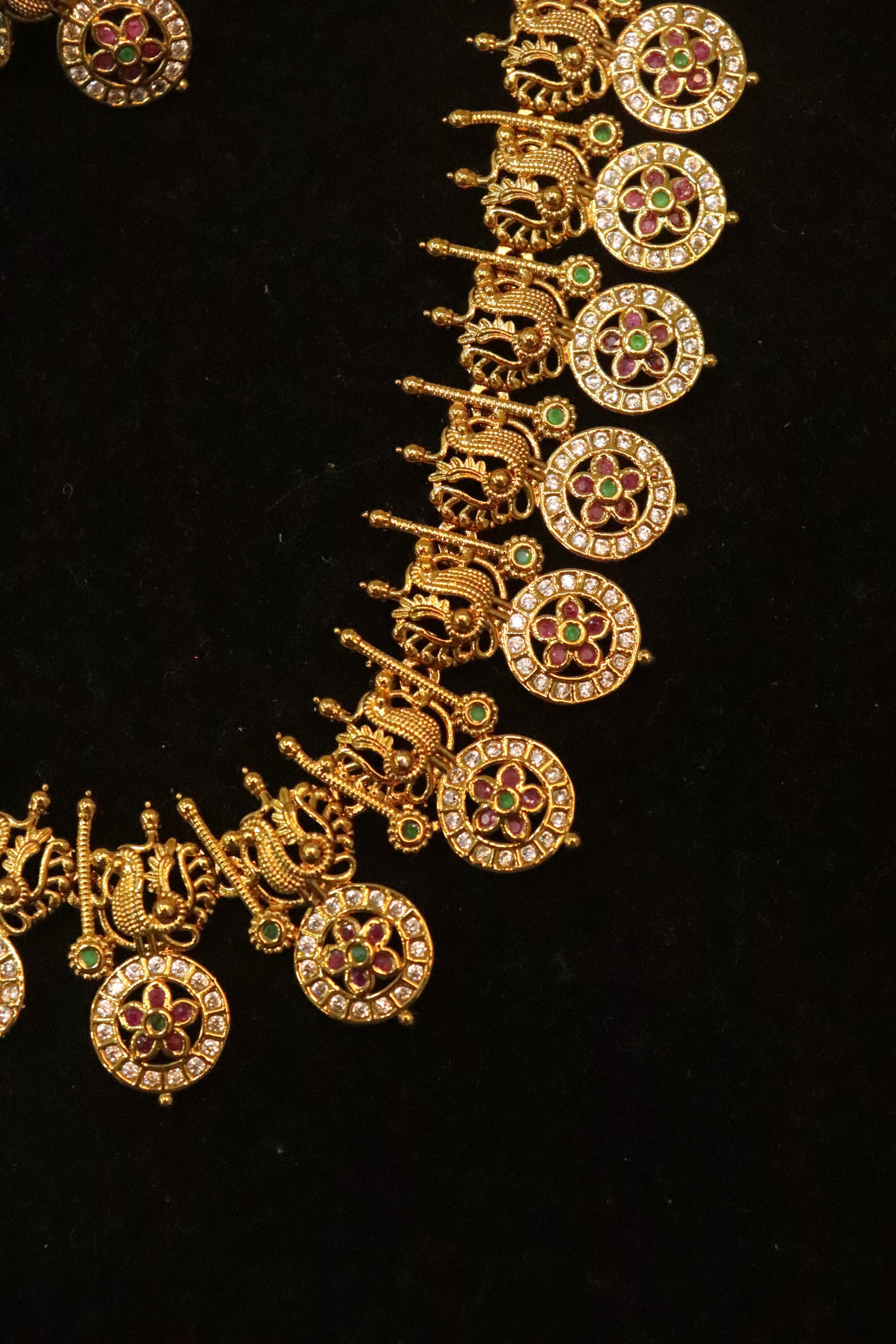 Celebrate classic South Indian elegance with this exquisite Floral Pottu Mala, crafted with traditional round pottu motifs adorned with delicate stonework. Designed in an antique gold finish, each circular element showcases a finely detailed floral pattern that brings a timeless charm to your look. Paired with matching earrings, this set beautifully blends heritage styling with refined craftsmanship.