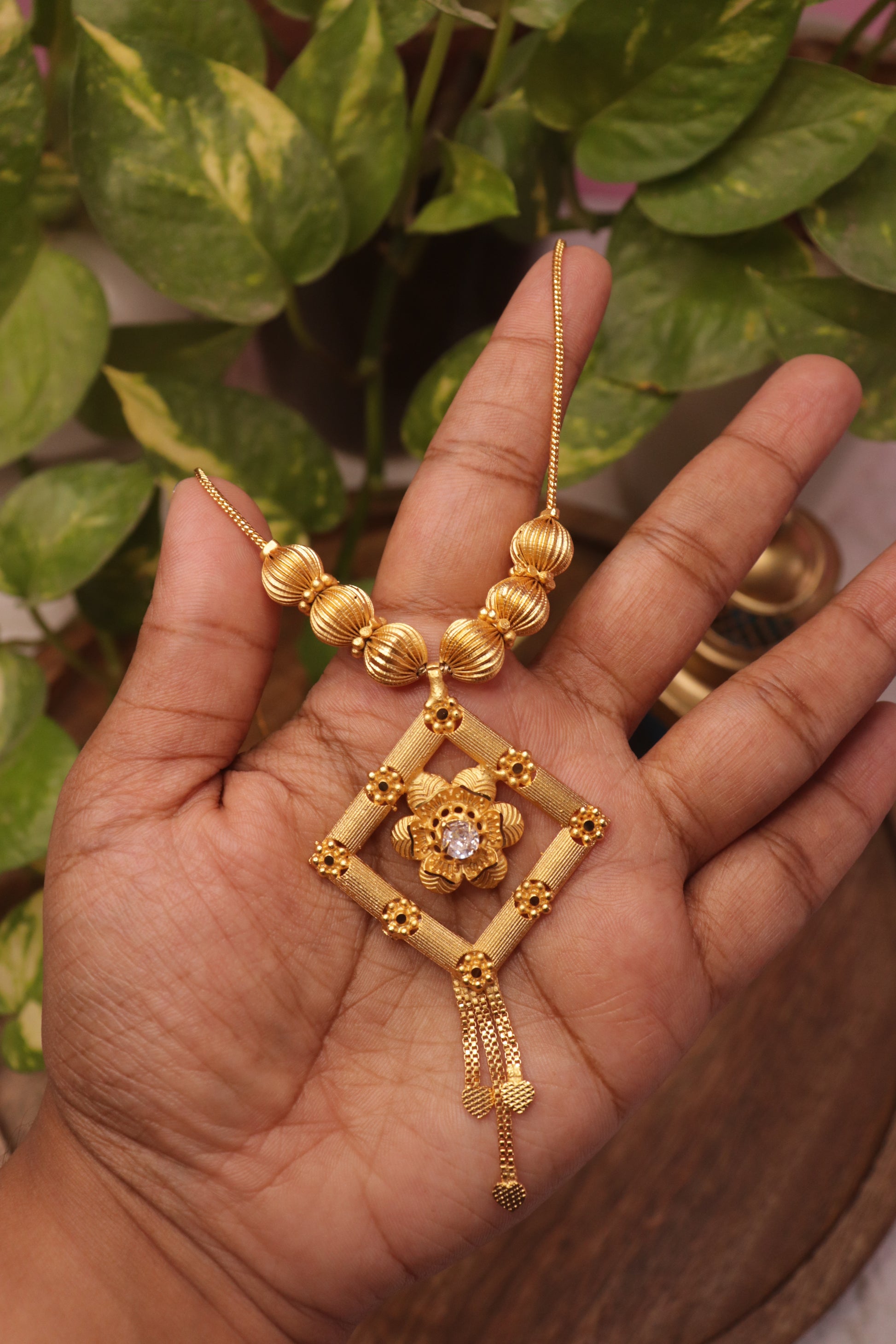 Pendant Detail: Intricately designed square floral pendant with central stone and dangling chain drops