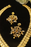 Evoke divine elegance with the Golden Lakshmi Coin Pearl Necklace Set — a timeless tribute to South Indian heritage and artistry. Designed with intricate temple motifs, shimmering CZ stones, and classic pearl accents, this piece exudes opulent grace perfect for festive and bridal occasions.