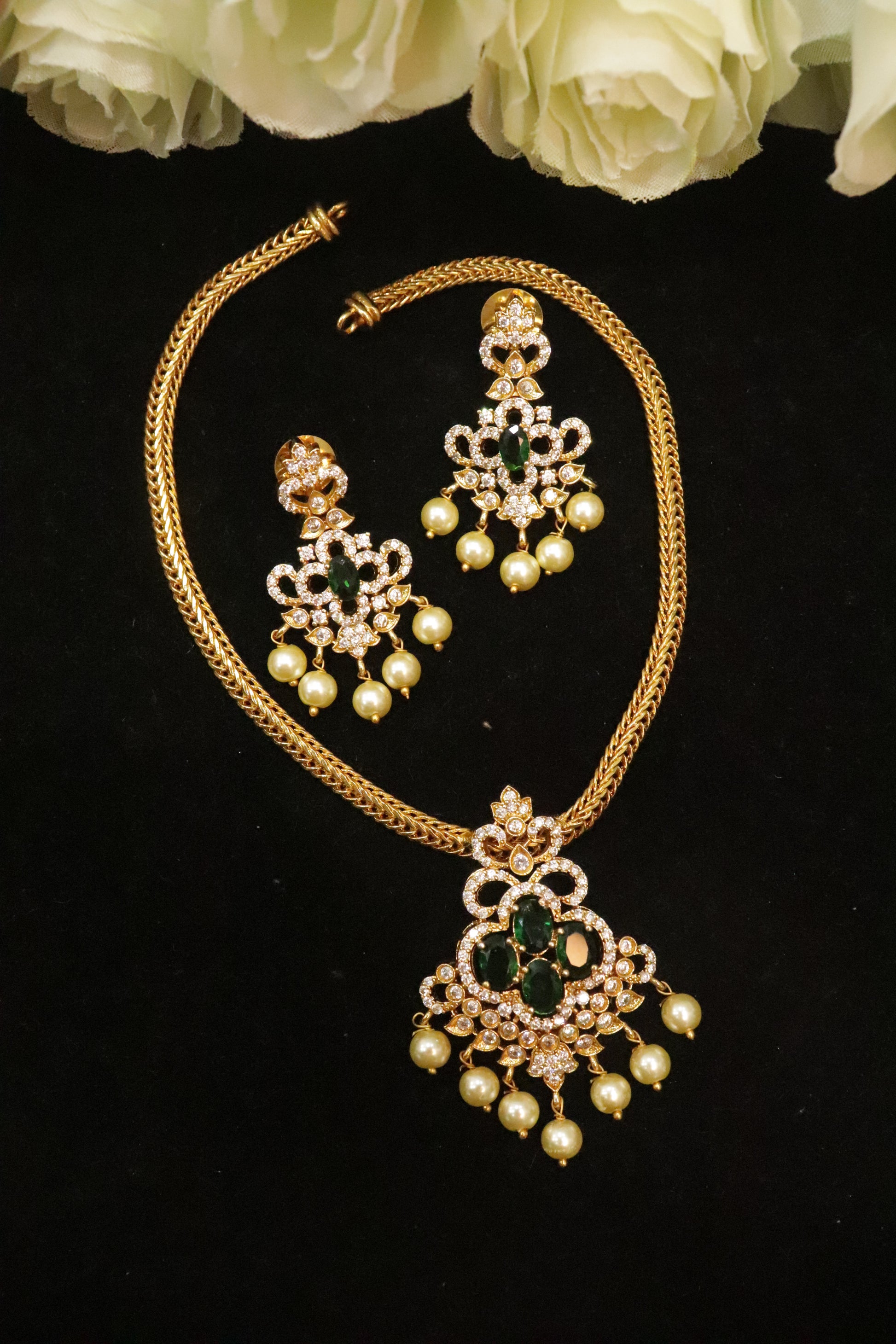 Embrace the soul of South Indian tradition with the Heritage Radiance AD Attigai Necklace Set — a breathtaking blend of age-old craftsmanship and contemporary sparkle. The classic Attigai silhouette, adorned with brilliant AD stones and graceful pearl drops, creates a statement piece that feels regal, vibrant, and forever timeless. Perfect for women who love jewellery that speaks of culture yet shines with modern finesse.