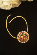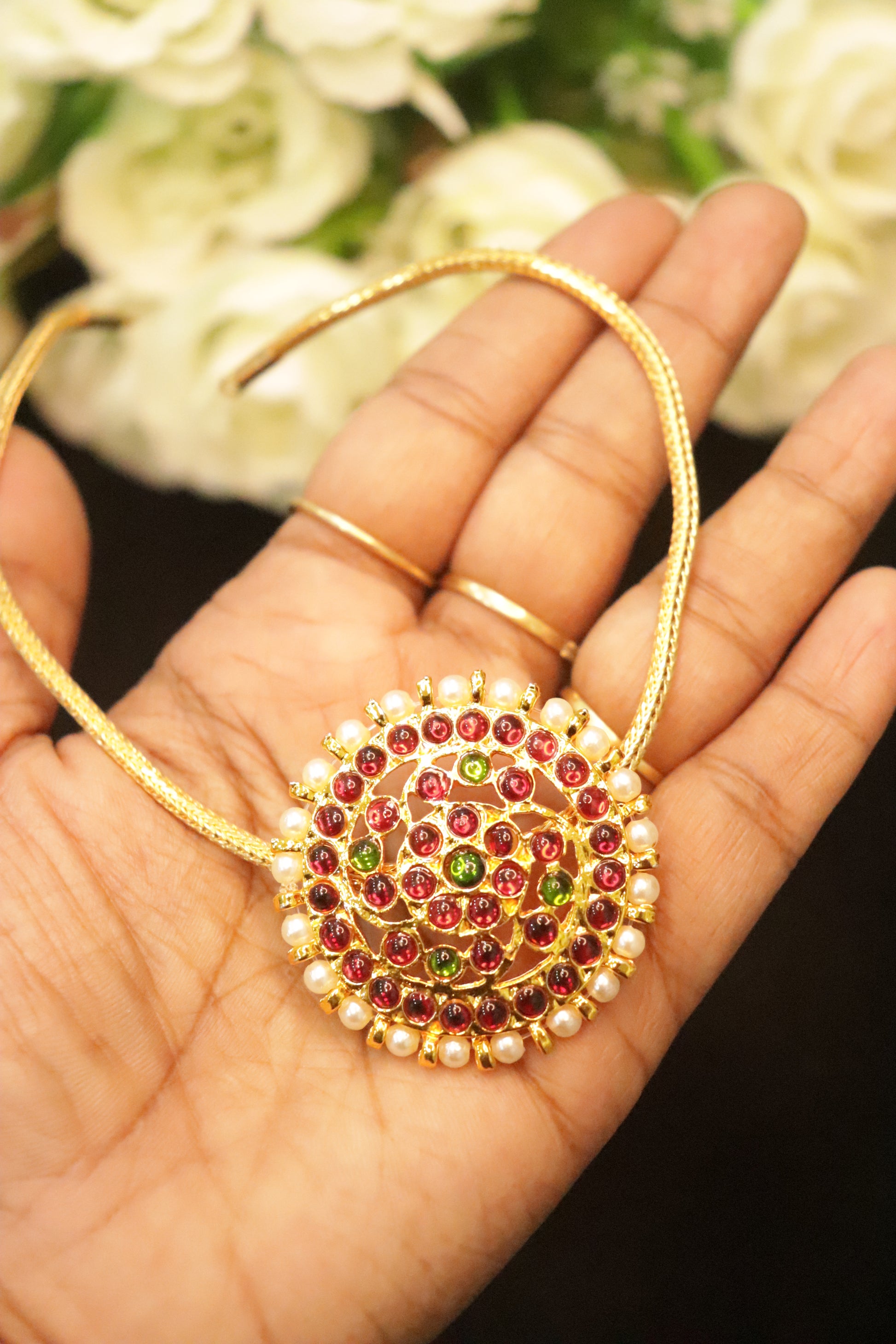 Illuminate your look with the Kemp Sun Pendant with Microplated Back Chain, a timeless piece inspired by traditional South Indian artistry. The radiant sun-shaped pendant is beautifully embellished with classic kemp stones arranged in a striking circular pattern, highlighted by a subtle green centre stone and finished with a delicate pearl border. Paired with a sleek microplated back chain, this necklace offers both elegance and comfort, making it a versatile addition to your jewellery collection.