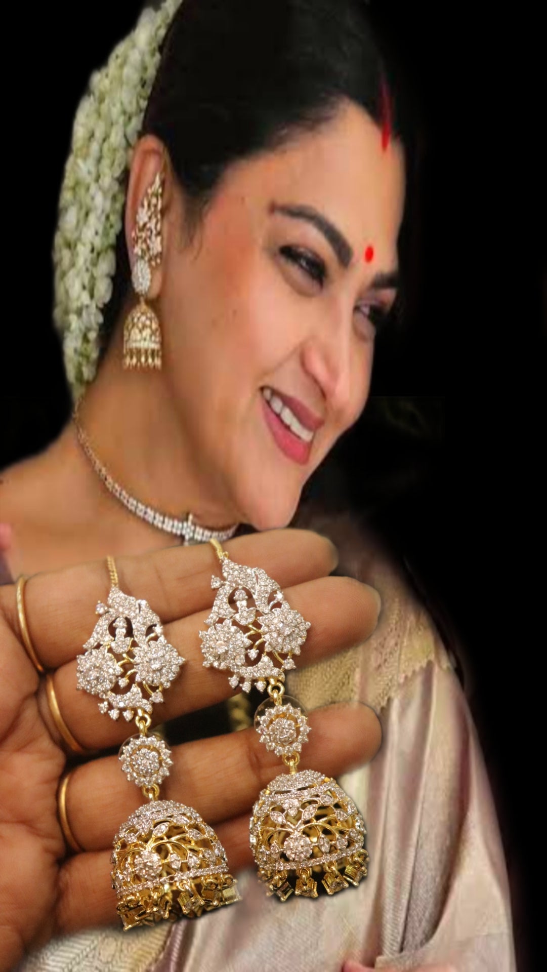 Celebrate timeless South Indian glamour with the Khushboo Inspired Royal GJ Polish Jhumka Earrings, a stunning fusion of vintage cinema elegance and modern sparkle. Designed with intricate floral patterns and layered dome-shaped jhumkas, these earrings radiate a rich diamond-like brilliance. The delicate craftsmanship and premium GJ polish create a luxurious finish that enhances both traditional and festive ensembles, making it a true statement accessory.