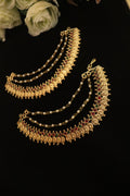 Enhance your bridal elegance with the Lakshmi Coin Bridal Ear Chain, a graceful temple-inspired accessory designed to beautifully complement traditional jhumkas. Featuring a delicate row of Lakshmi coin motifs adorned with rich ruby and emerald-toned stones, this elegant mattal adds a regal and divine charm to your bridal ensemble. The layered pearl chains create a soft, feminine drape that enhances the overall look while providing support to heavier earrings. Finished in a classic antique gold polish, this ear chain blends traditional artistry with timeless sophistication, making it an essential addition to every South Indian bridal jewellery collection.