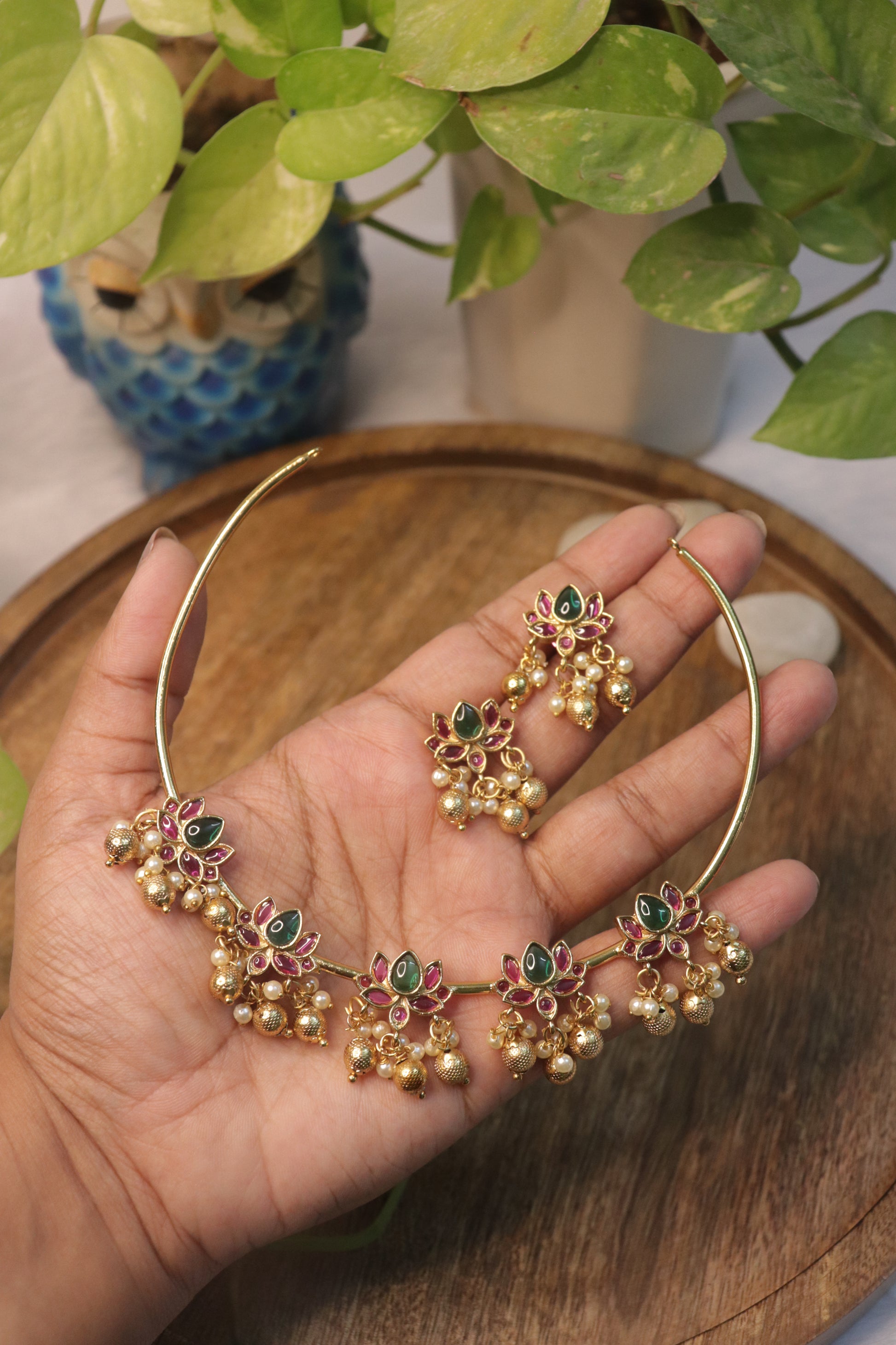 Illuminate your look with the Lotus Glow Hasli Necklace Set — a graceful blend of modern finesse and traditional artistry. Inspired by the purity of the lotus, this elegant matte-finish piece features floral motifs adorned with deep green and ruby-hued stones, finished with delicate pearl and golden bead drops.
