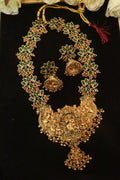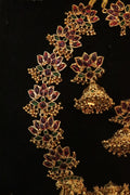 Embrace divine opulence with the Lotus Radiance Matte Rani Haar Set — an exquisite creation that celebrates heritage artistry and goddess-like grace. The Gajalakshmi pendant, framed by blooming lotus motifs, brings together traditional symbolism and regal splendour in a truly captivating design.