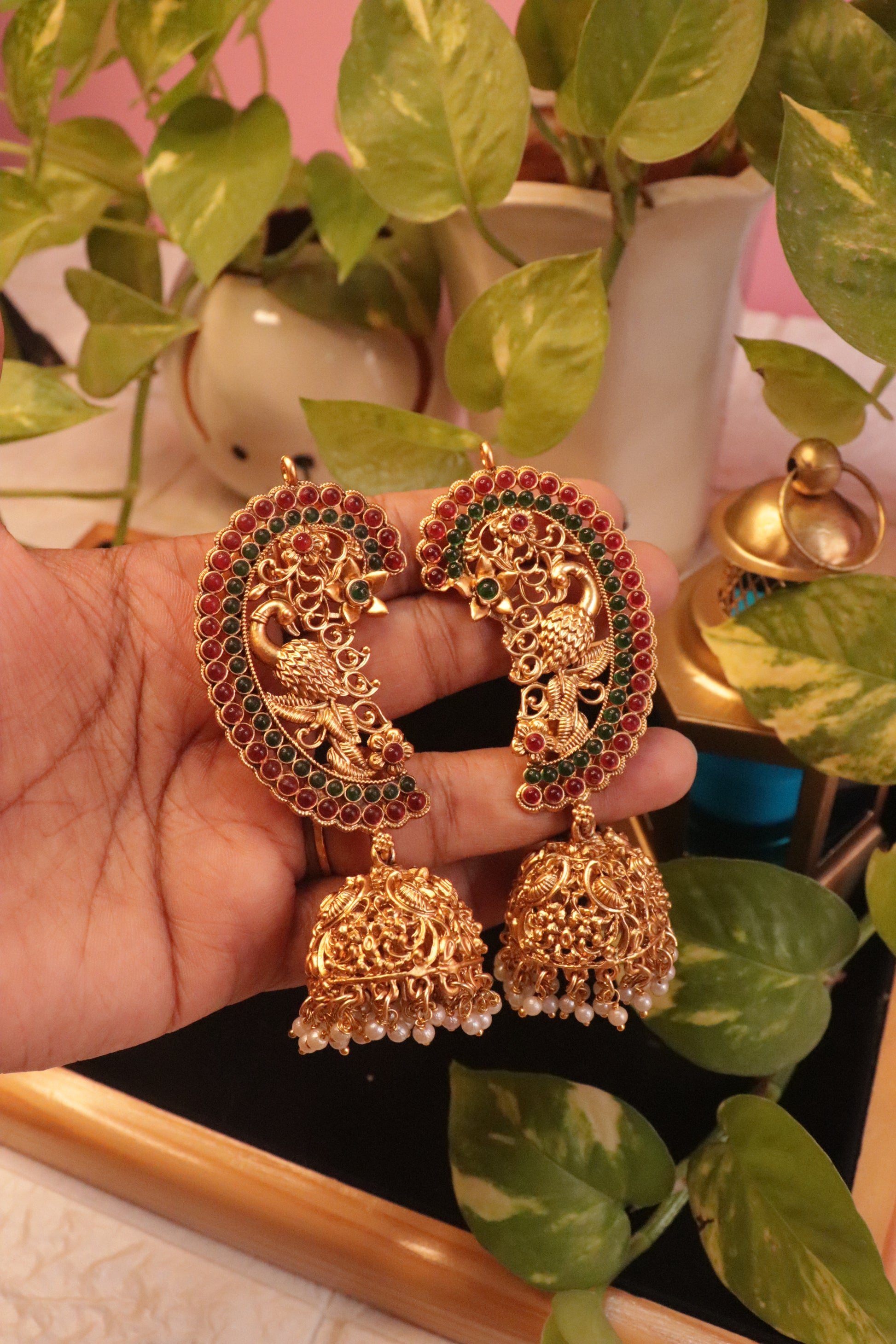 Celebrate timeless artistry with the Mayura Ruby Matte Jhumka, inspired by the grace of peacock motifs. This exquisite pair features intricate matte gold detailing adorned with rich ruby-red stones and elegant pearl hangings. The beautifully carved jhumka adds a majestic charm, making it a perfect choice for traditional and festive ensembles.