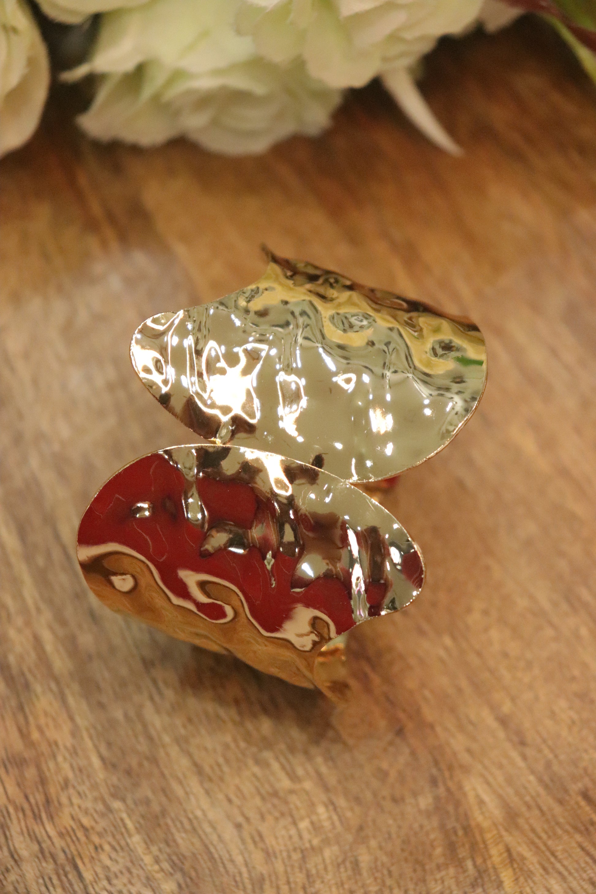Make a striking style statement with the Molten Wave Statement Gold Kada Bangle — a bold expression of modern artistry and contemporary elegance. Designed with an organic, fluid hammered texture, this open kada bangle reflects light beautifully, creating a molten-gold effect that feels both artistic and luxurious. Its sculptural silhouette makes it a standout accessory for confident, fashion-forward styling.