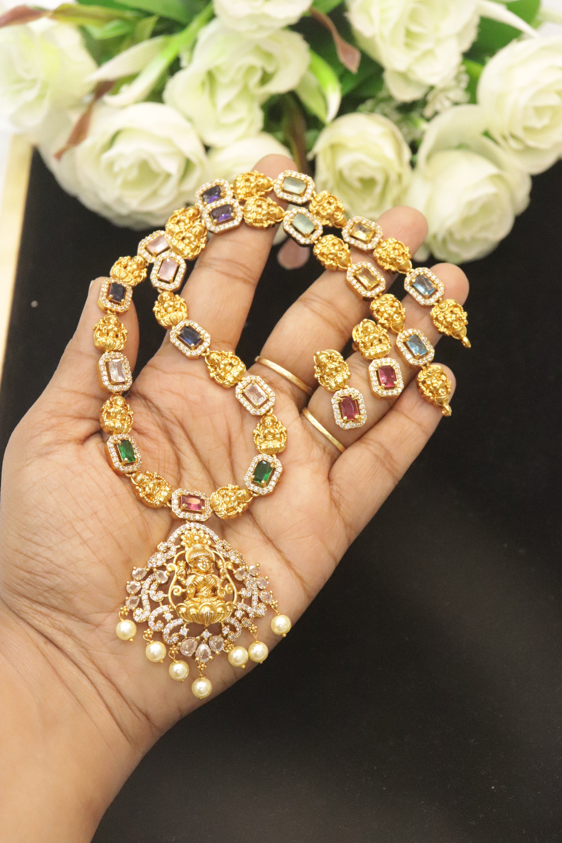 Pendant Detail: Intricately designed Lakshmi pendant enhanced with pearls and shimmering stones.