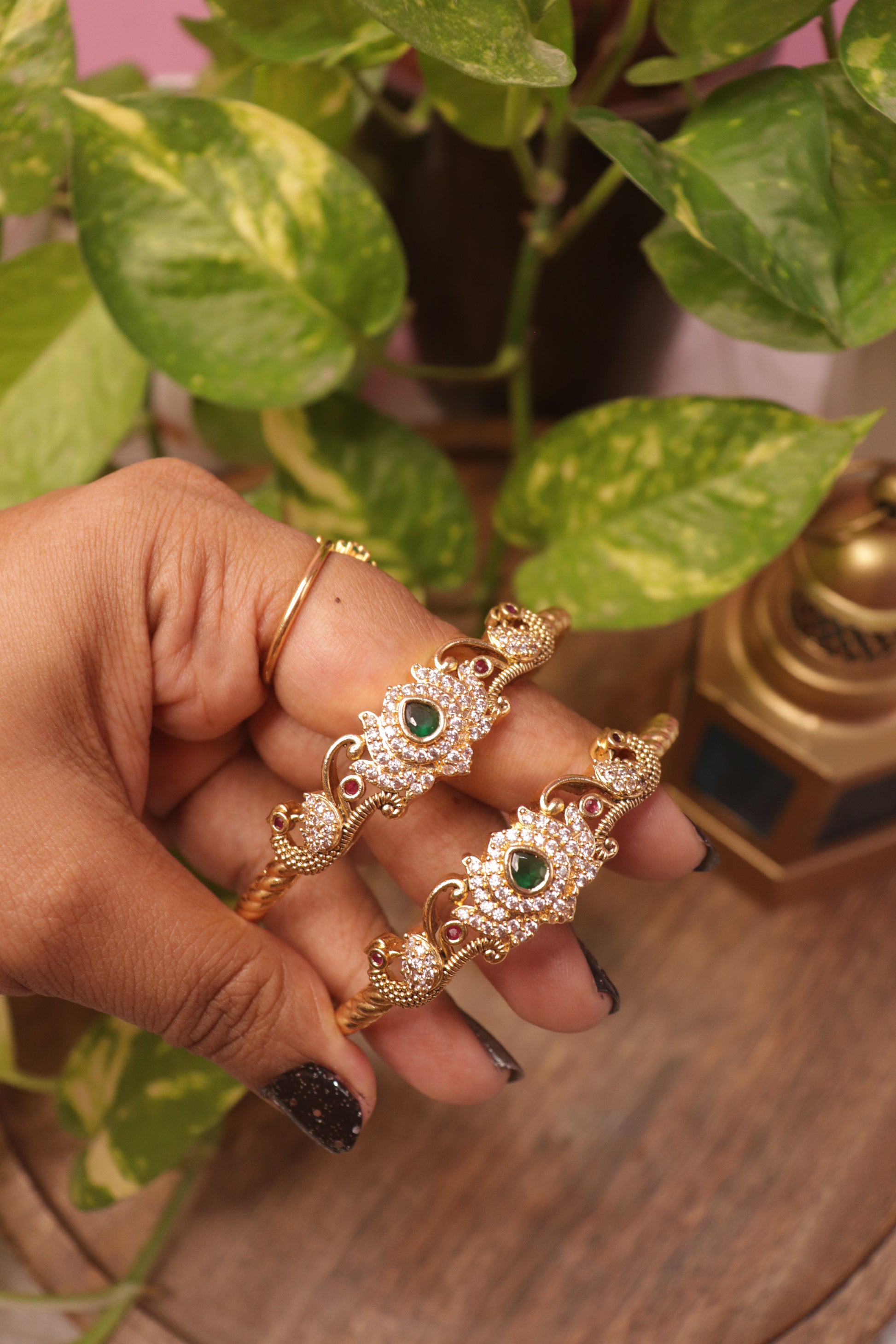 Step into timeless grace with these intricately designed bangles that beautifully merge the elegance of the peacock with the purity of the lotus. Adorned with vibrant stones and fine detailing, they bring together the charm of nature and the luxury of tradition.