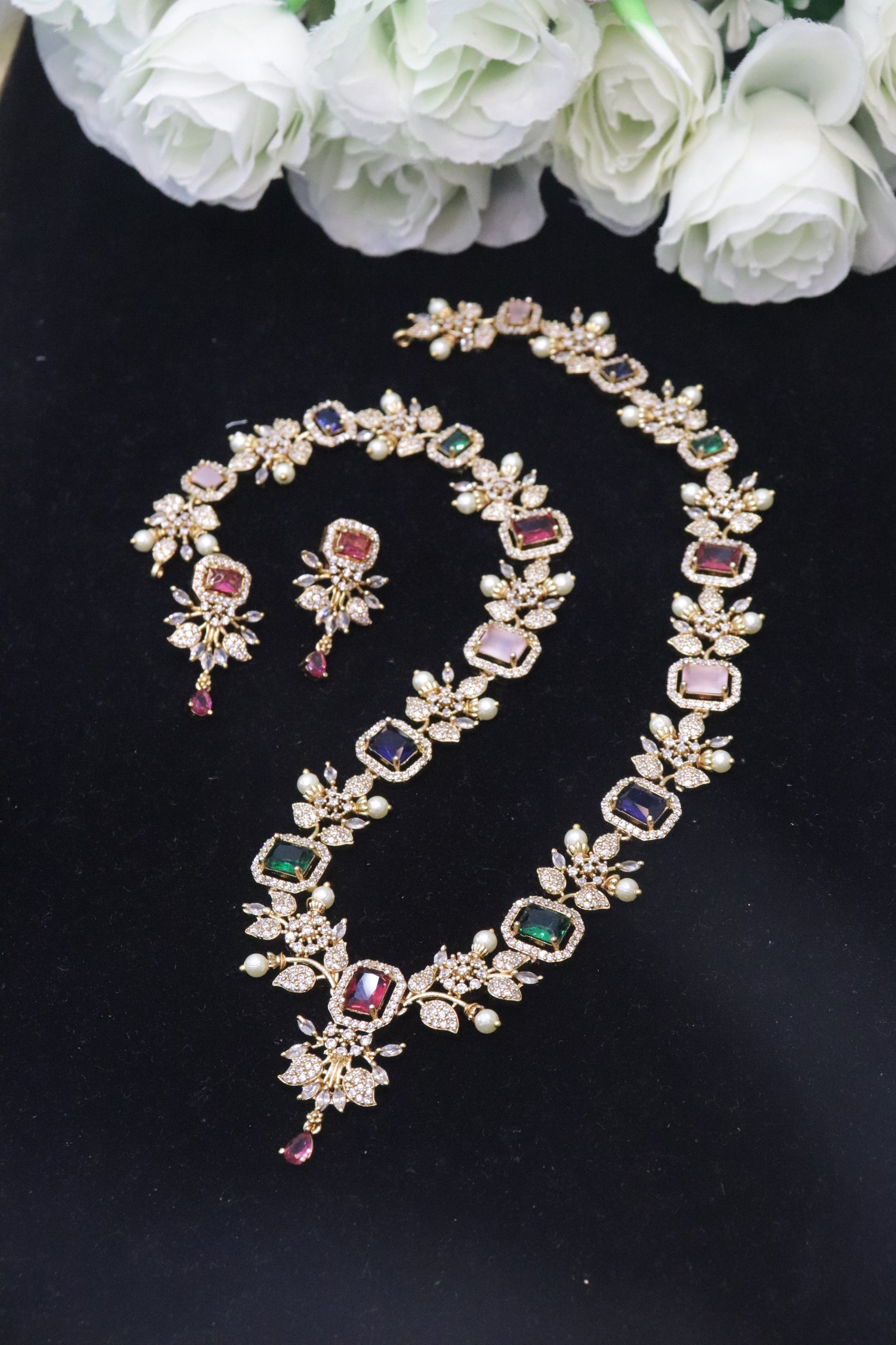 A statement masterpiece that blends modern sparkle with classic design, the Radiant Floral Multi-Stone Necklace Set is perfect for those who adore jewellery that feels both luxurious and effortlessly elegant.