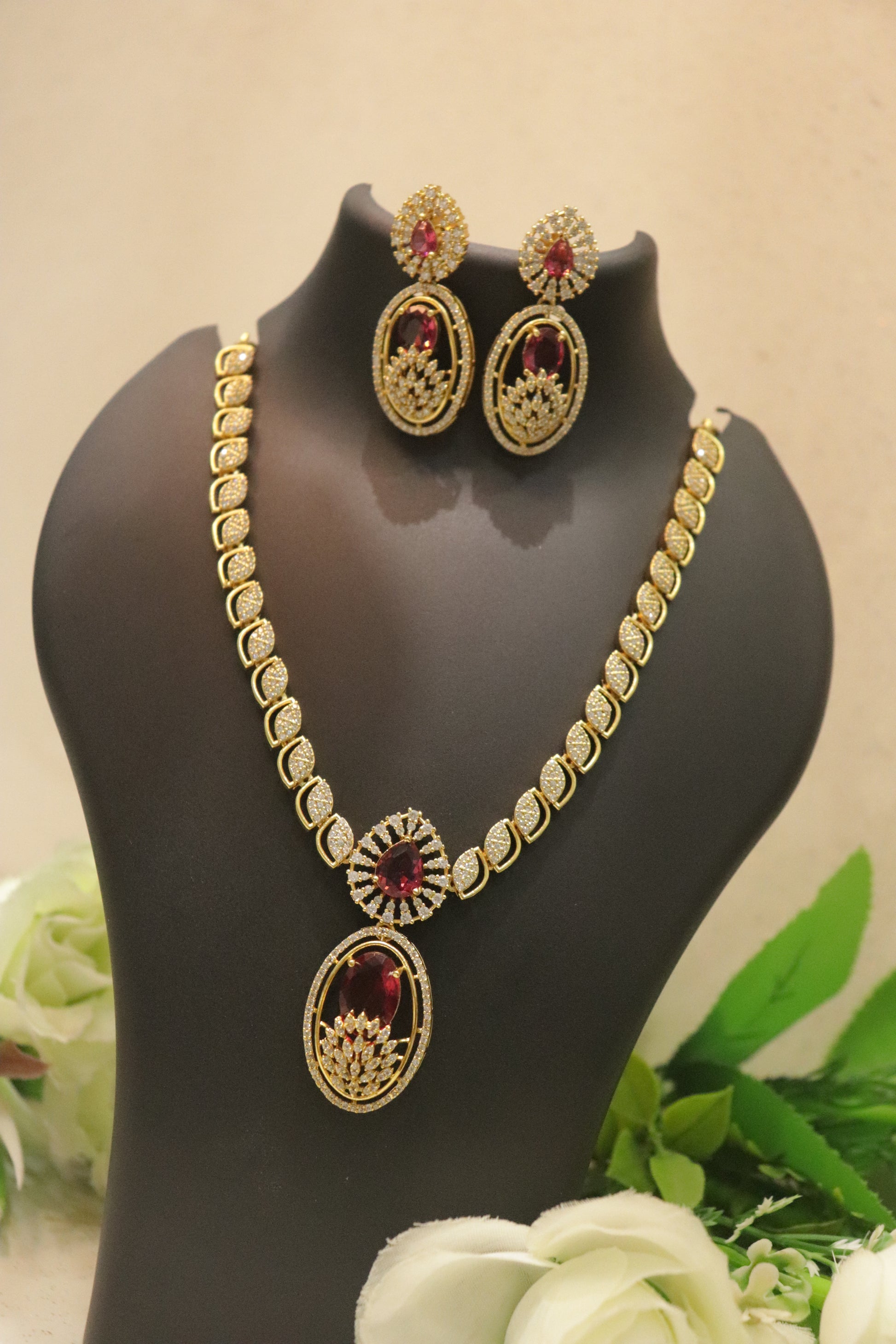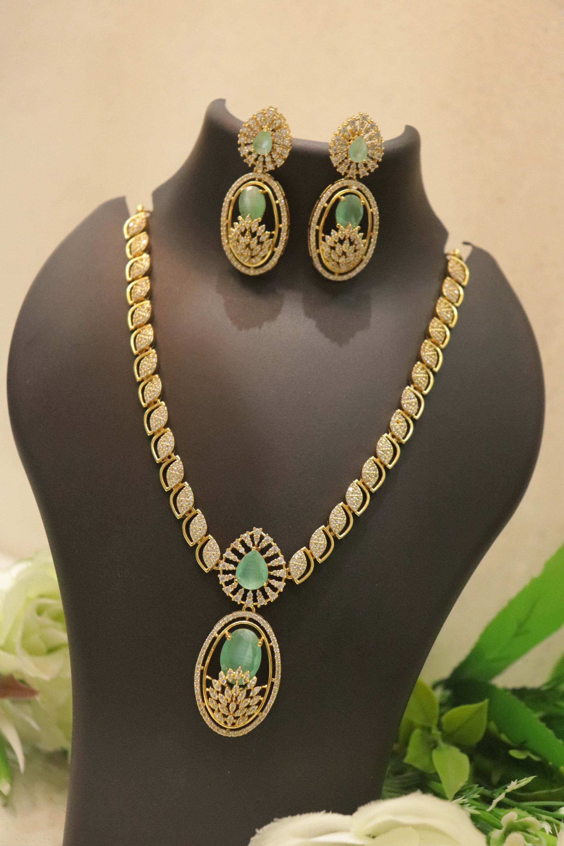 Elevate your festive and occasion wear with the Radiant Oval Double Drop AD Necklace Set, a sophisticated design that blends graceful structure with dazzling brilliance. The necklace features a sleek patterned chain adorned with shimmering AD stones, leading to a striking double-drop oval pendant highlighted by layered stone work and a bold teardrop accent. Paired with perfectly matching statement earrings, this set delivers a refined and luxurious finish that enhances both traditional and contemporary outfits. Available in five elegant colour options — purple, ruby, green, pink, and mint — so you can choose the perfect shade for every look.