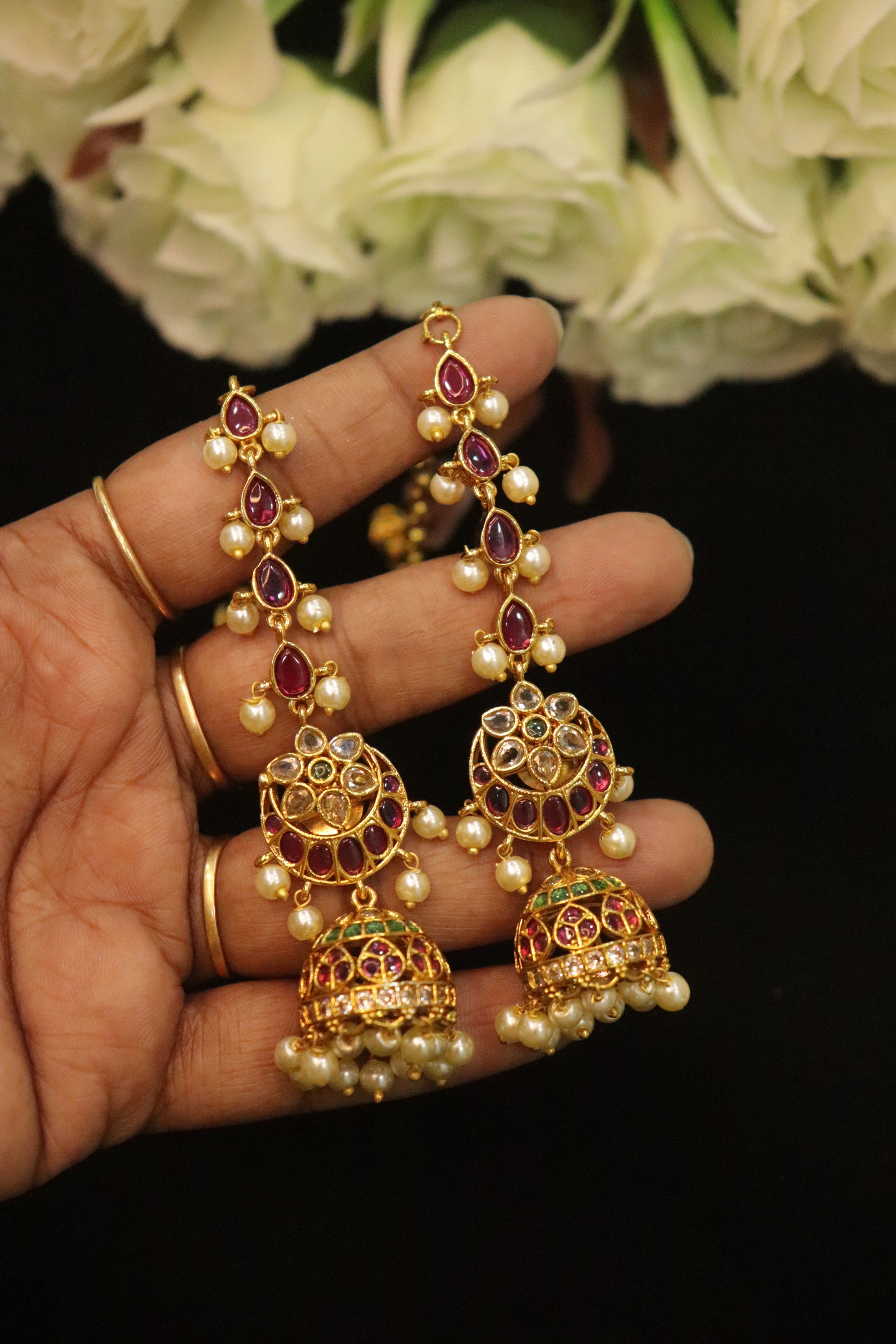 Detailing: Teardrop stone links, ornate circular motifs, and elegant pearl hangings that add movement and richness.