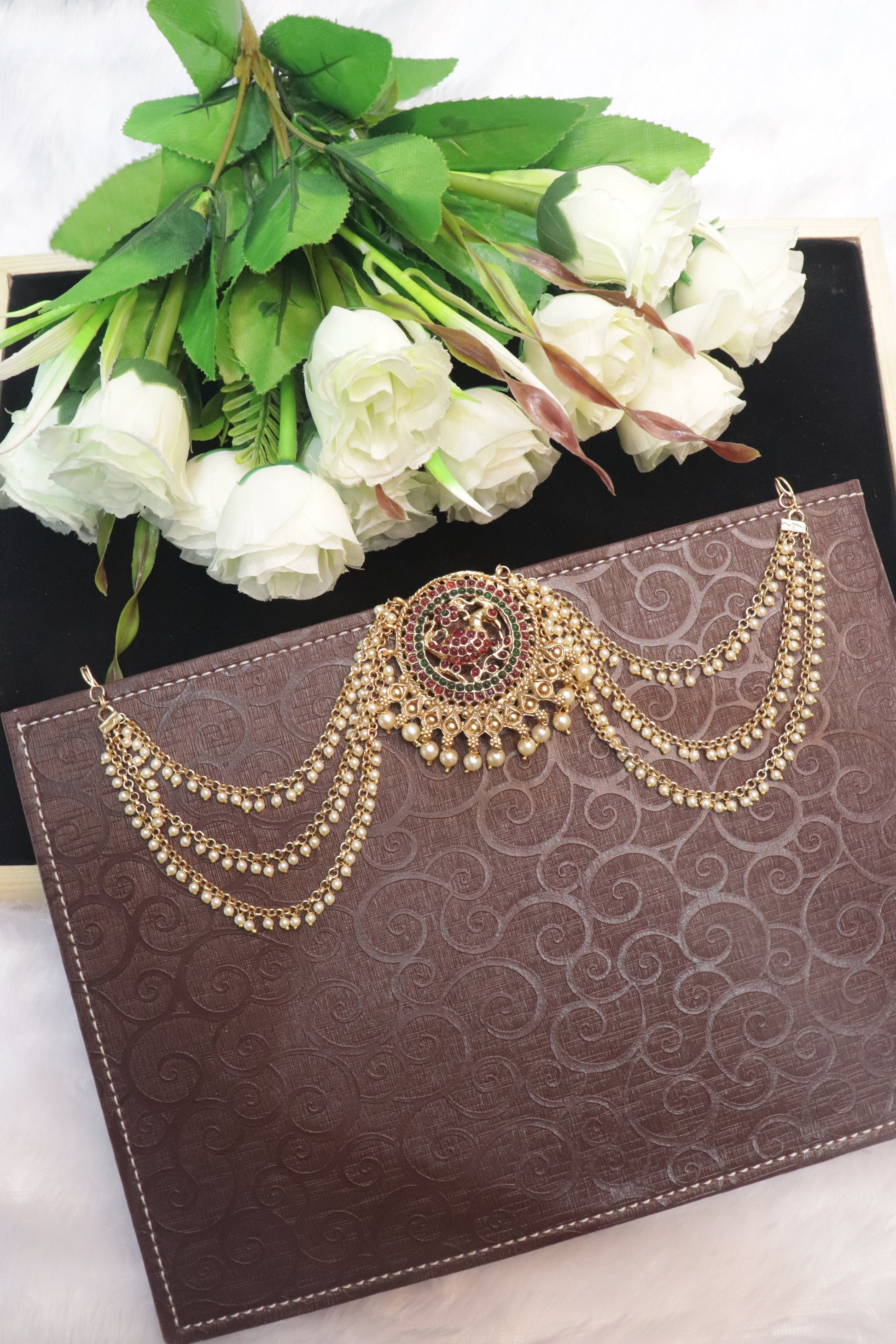 Channel the majesty of tradition with the Regal Peacock Antique Jada Billa — a splendid creation that captures the grace and grandeur of classic temple jewellery. The centerpiece features an intricately carved peacock framed by ruby-toned stones, radiating divine charm and cultural richness.