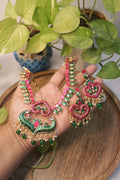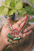 Step into a world of colour and charm with the Rosette Gleam Enamel Necklace Set — a beautiful fusion of artistry and tradition. The soft pink and vivid green enamel work creates a refreshing palette, while the gold-toned detailing adds a subtle regal glow. Designed to stand out effortlessly, this piece brings a lively, feminine grace to every festive or ethnic look.