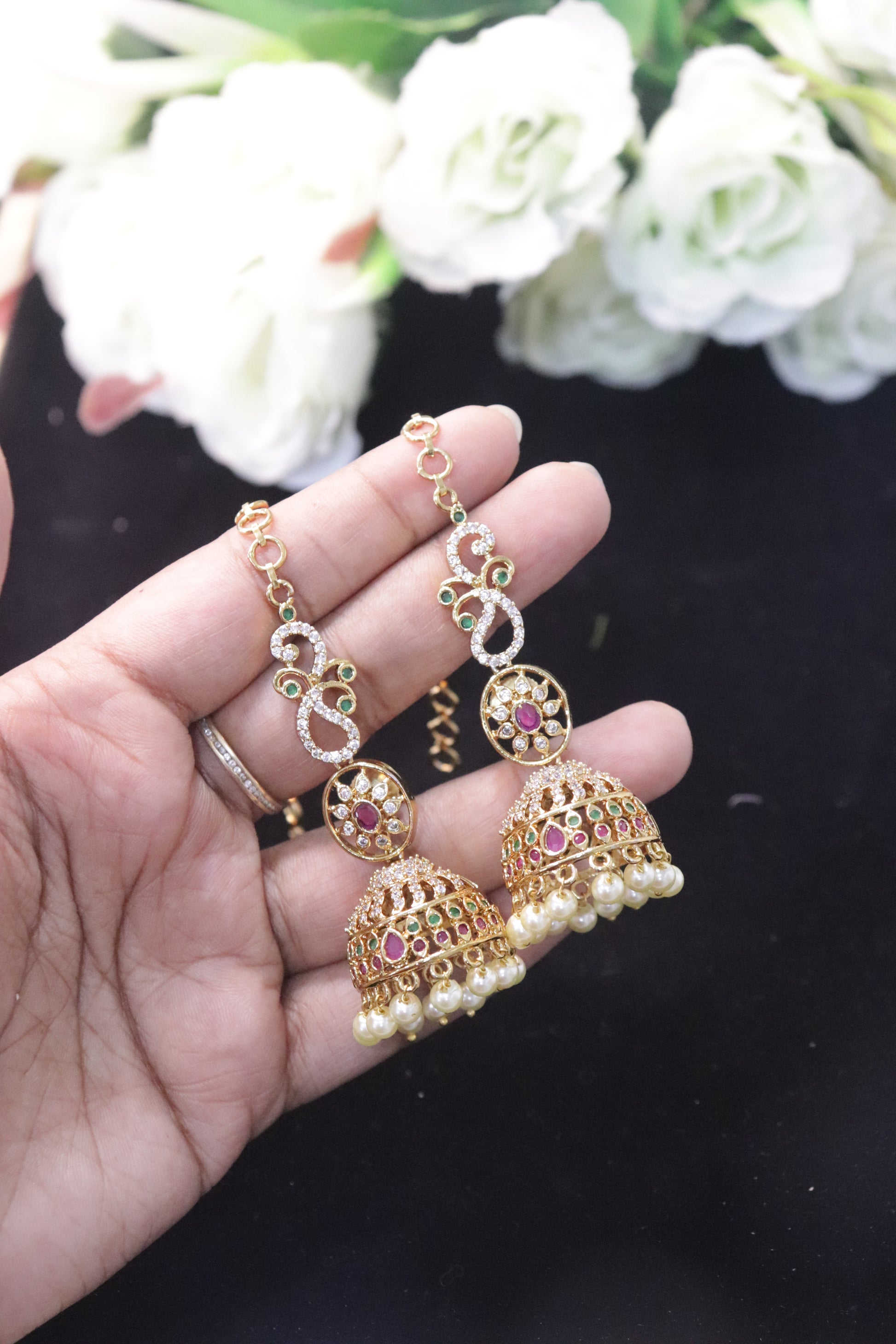Step into timeless elegance with the Royal Bloom Ruby Emerald Jhumka Earrings, a captivating blend of traditional artistry and regal beauty. These earrings feature intricate swirl patterns set with sparkling CZ stones, leading to exquisite domed jhumkas adorned with ruby, emerald, and pearl accents — a celebration of heritage and craftsmanship.