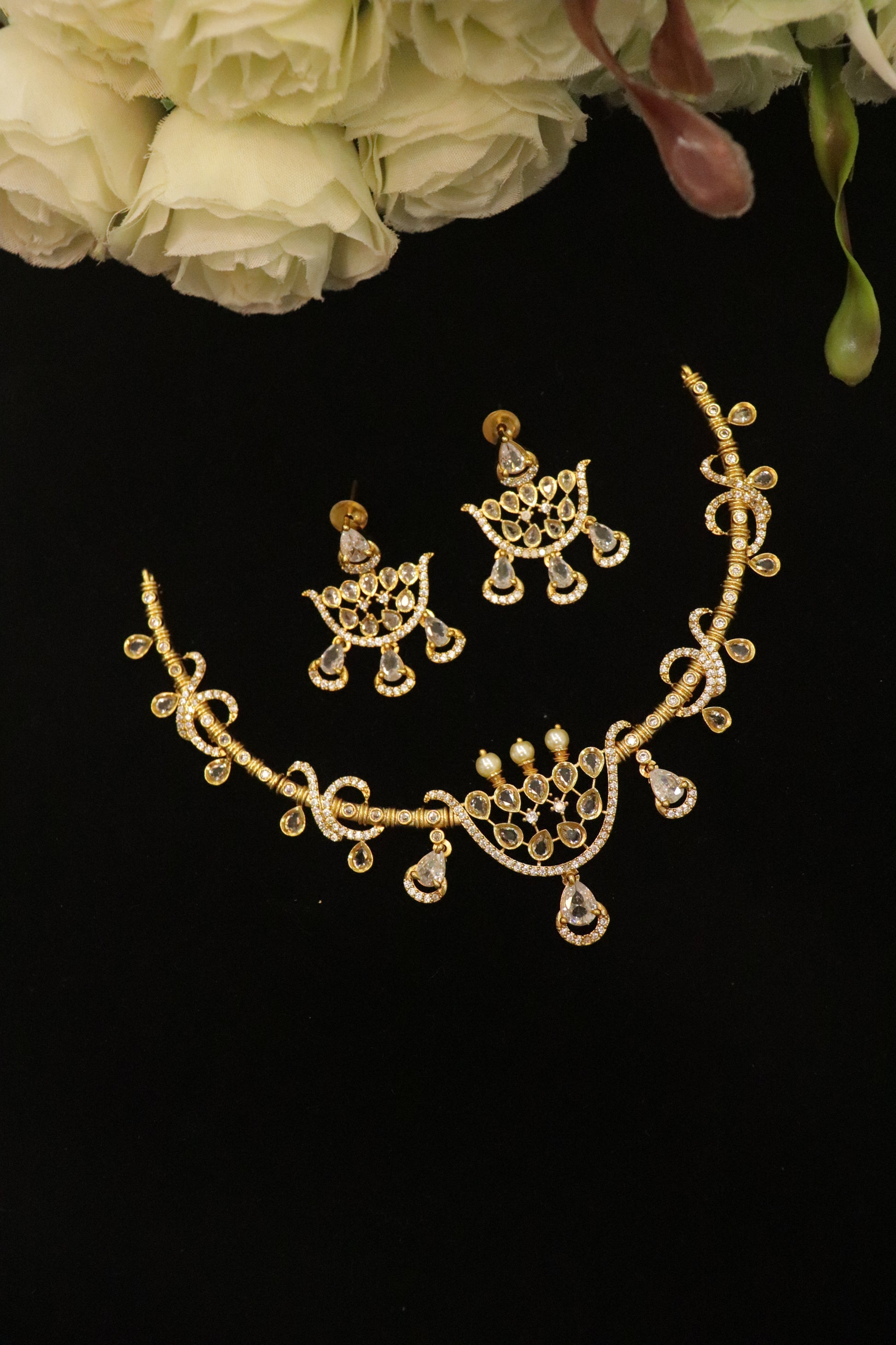 Necklace Detail: Intricately arranged AD stones with elegant teardrop danglers that enhance movement and shine.