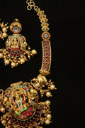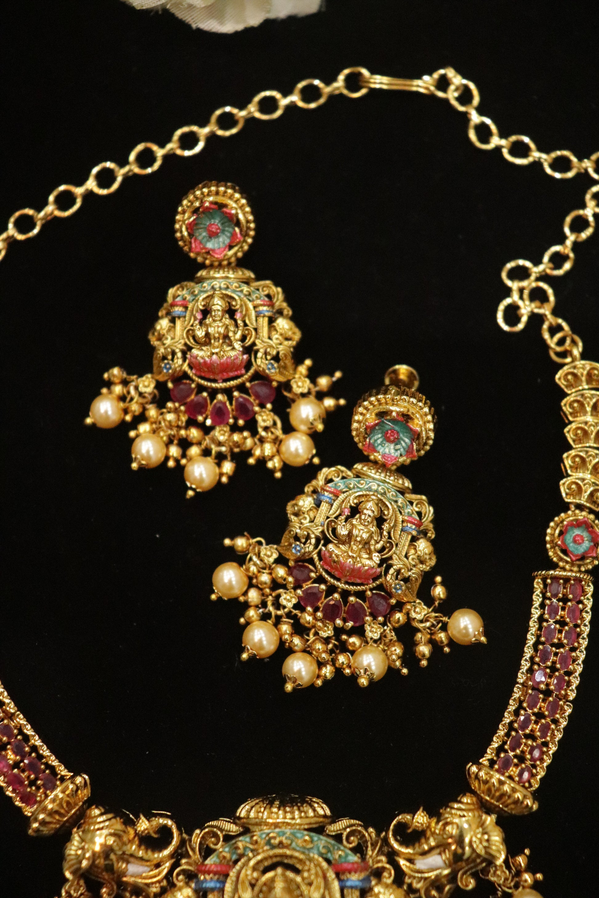 Royal Handpainted Meenakari Lakshmi Antique Temple Necklace Set with Pearl Drops