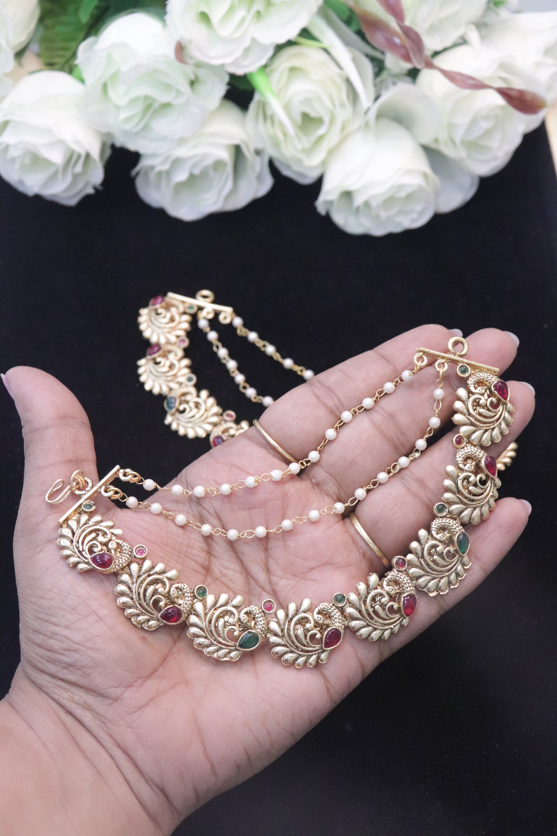 Step into timeless elegance with the Royal Peacock Antique Pearl Ear Chain, a celebration of heritage and artistry. Designed with intricate peacock motifs and enriched with ruby and emerald stones, this piece exudes divine charm and traditional splendor.