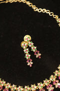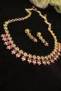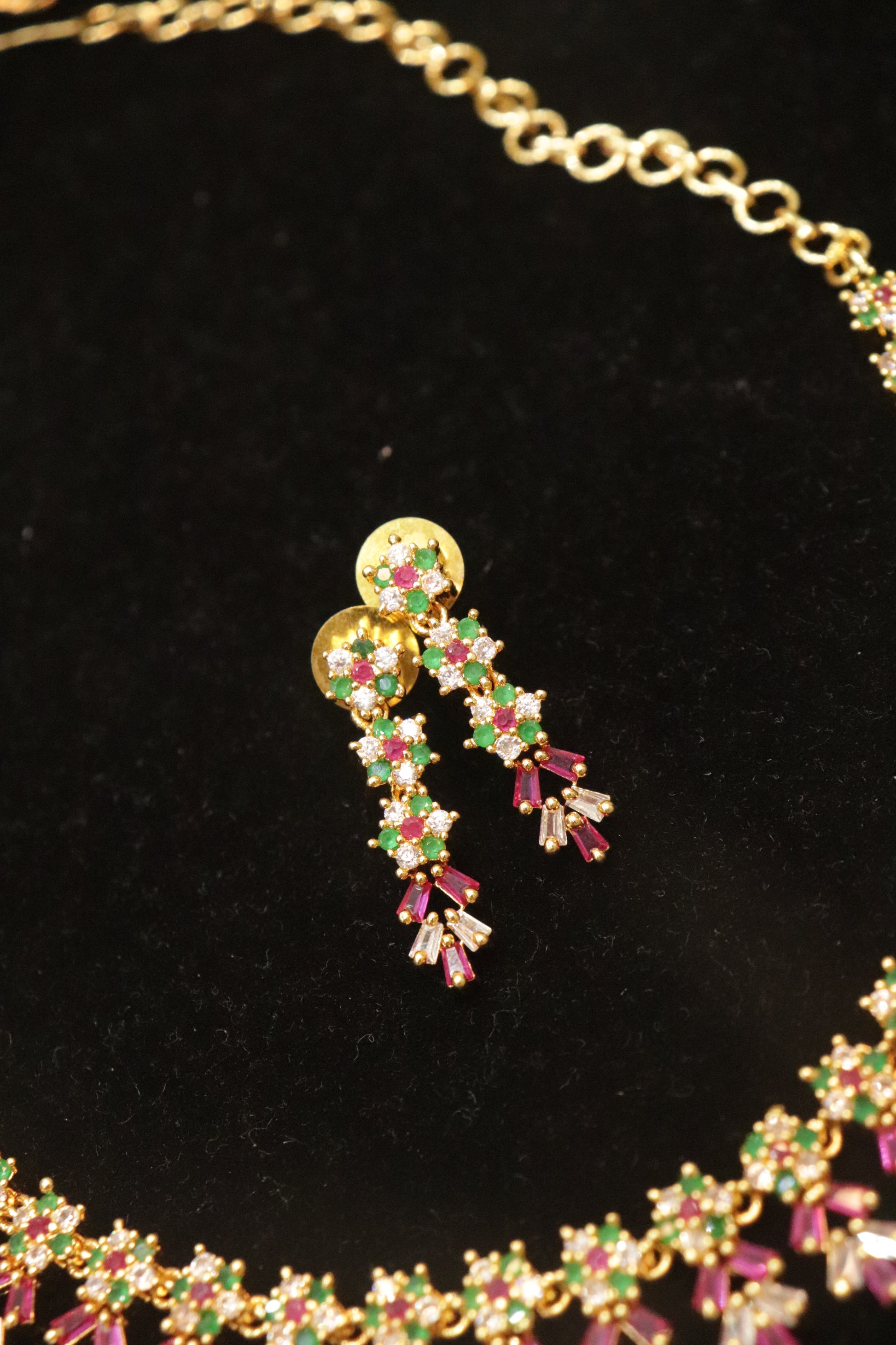 Embrace the brilliance of tradition with the Ruby Flora CZ Necklace Set, a graceful blend of floral artistry and regal sparkle. The gold finish paired with ruby red, emerald green, and CZ stones creates a radiant harmony perfect for festive occasions.